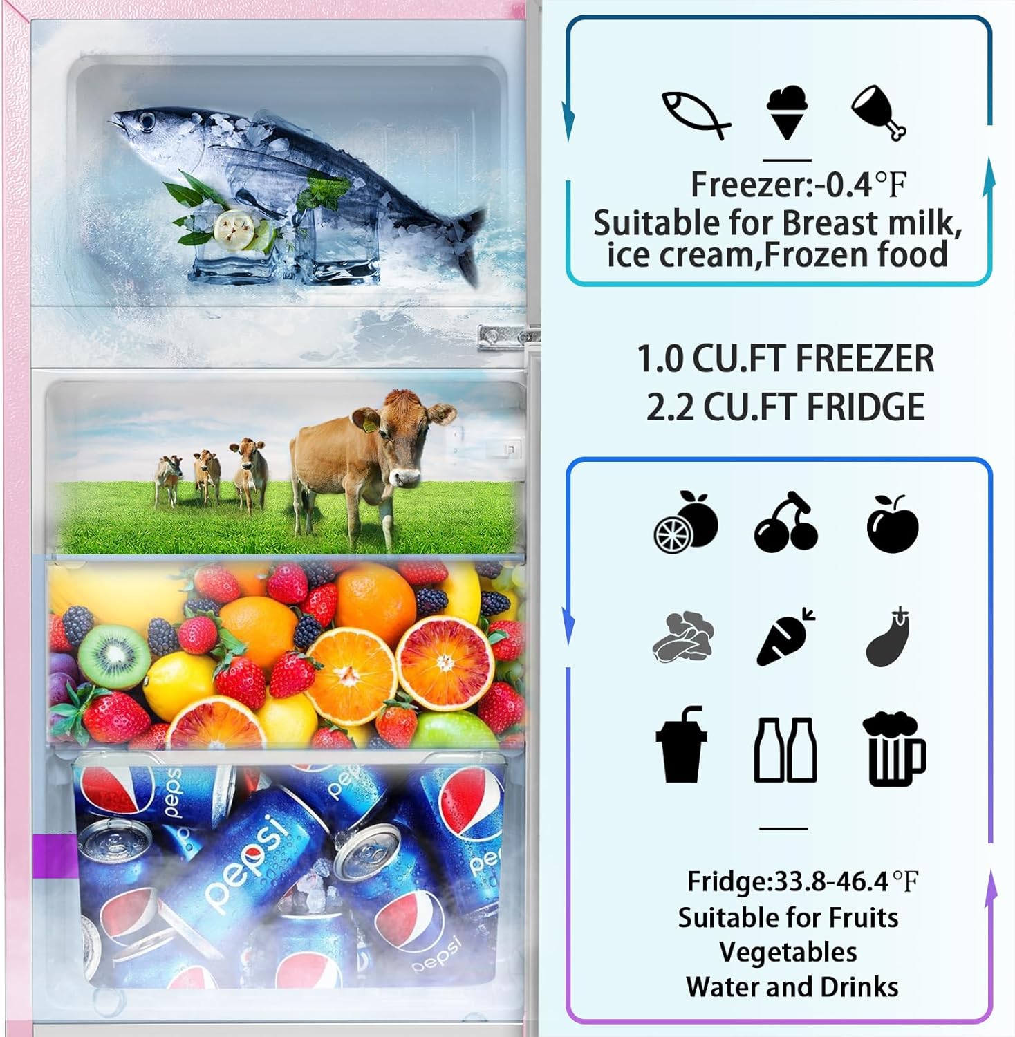 - REMOVEABLE GLASS SHLEF:The glass shelf and drawer separate fruit and vegetable; A removable slide-out glass shelf provides more ways to organize your storage needs; Bonus ice tray and shovel can help make ice cube chill your drinking
