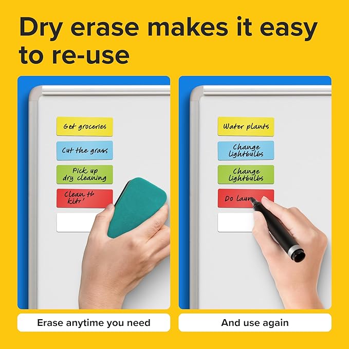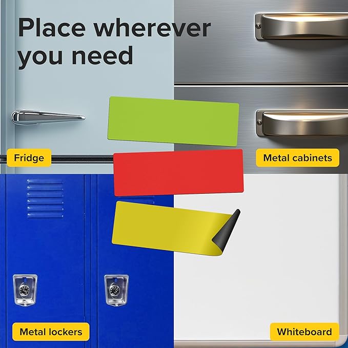 - ✅ EASY TO INSTALL and REUSABLE writable magnetic accents stickers. Write on them with a dry erase marker, wipe them off and use them again. Dry erase magnetic tape use for labeling storage shelves, labeling cabinets, whiteboards, magnet labels on the refrigerator, toolboxes, teaching aids, message boards, stockroom shelf labels, menu boards, planning boards, file cabinets, refrigerators, retail signs, and every other magnetic surface