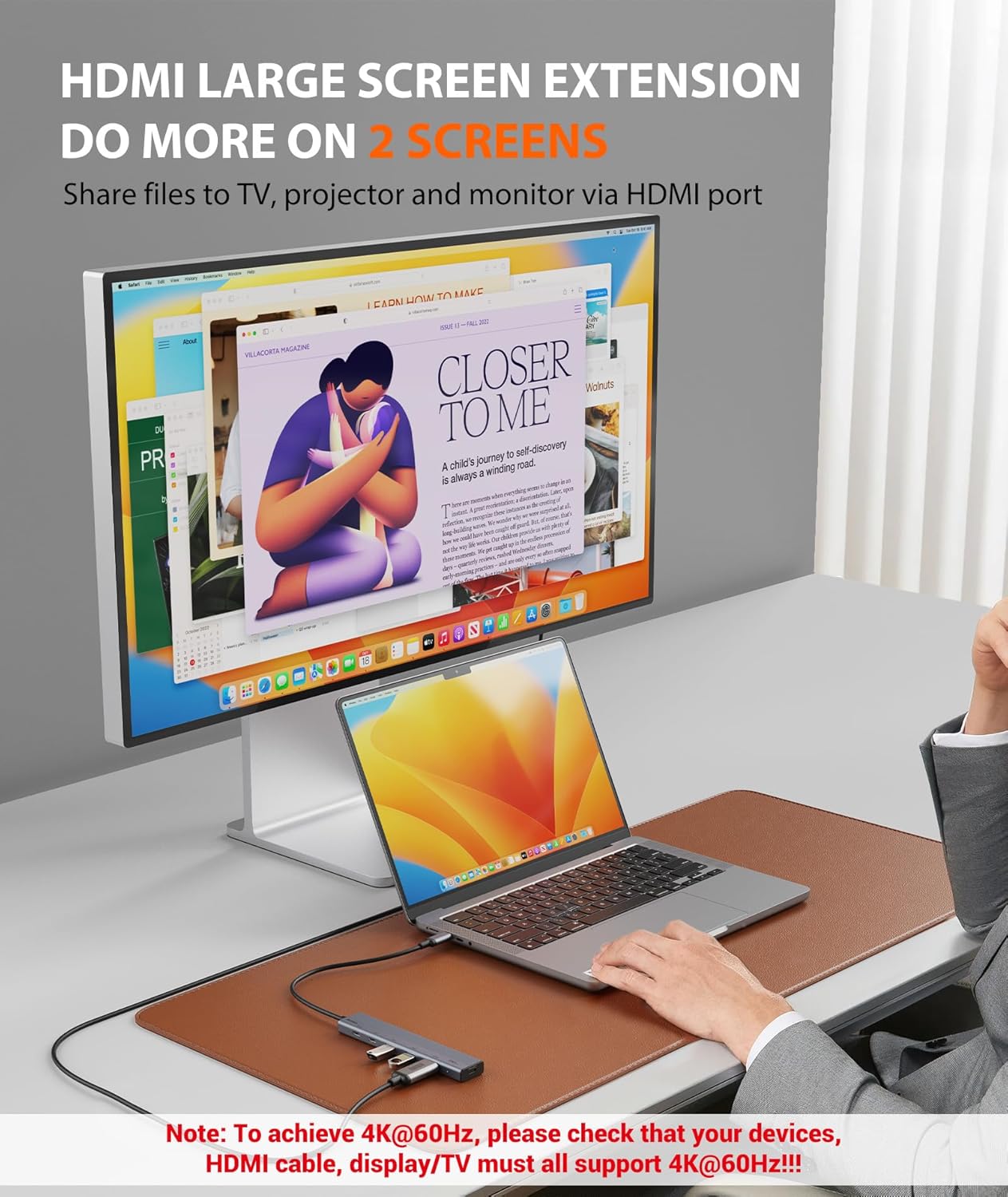 - 4K@60Hz Immersive Display: Simply connect to an external monitor via the 4K HDMI port of the USB C hub multiport adapter to see all in sharp and glorious detail. NOTE: Pls ensure that your device supports video output via the usb c port.