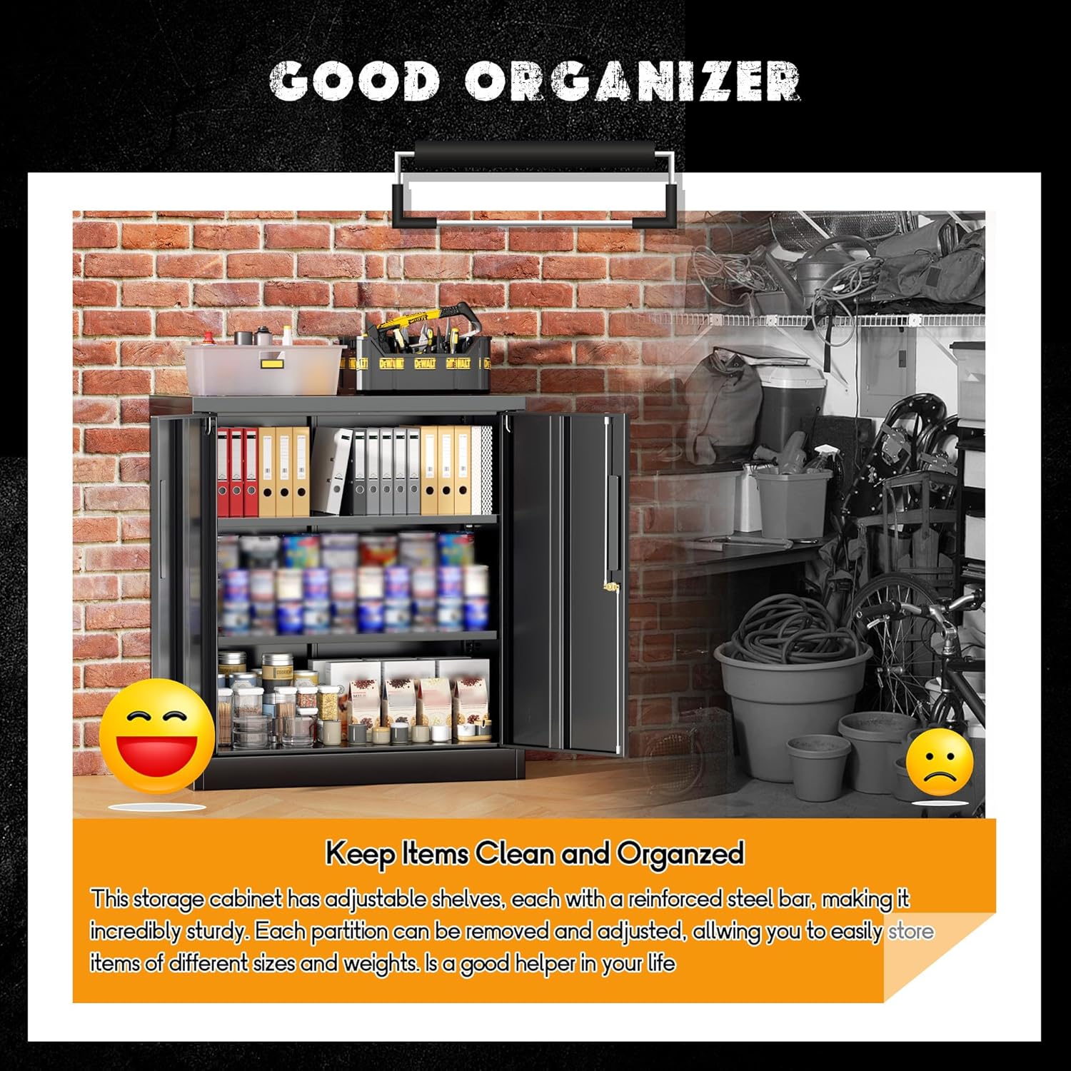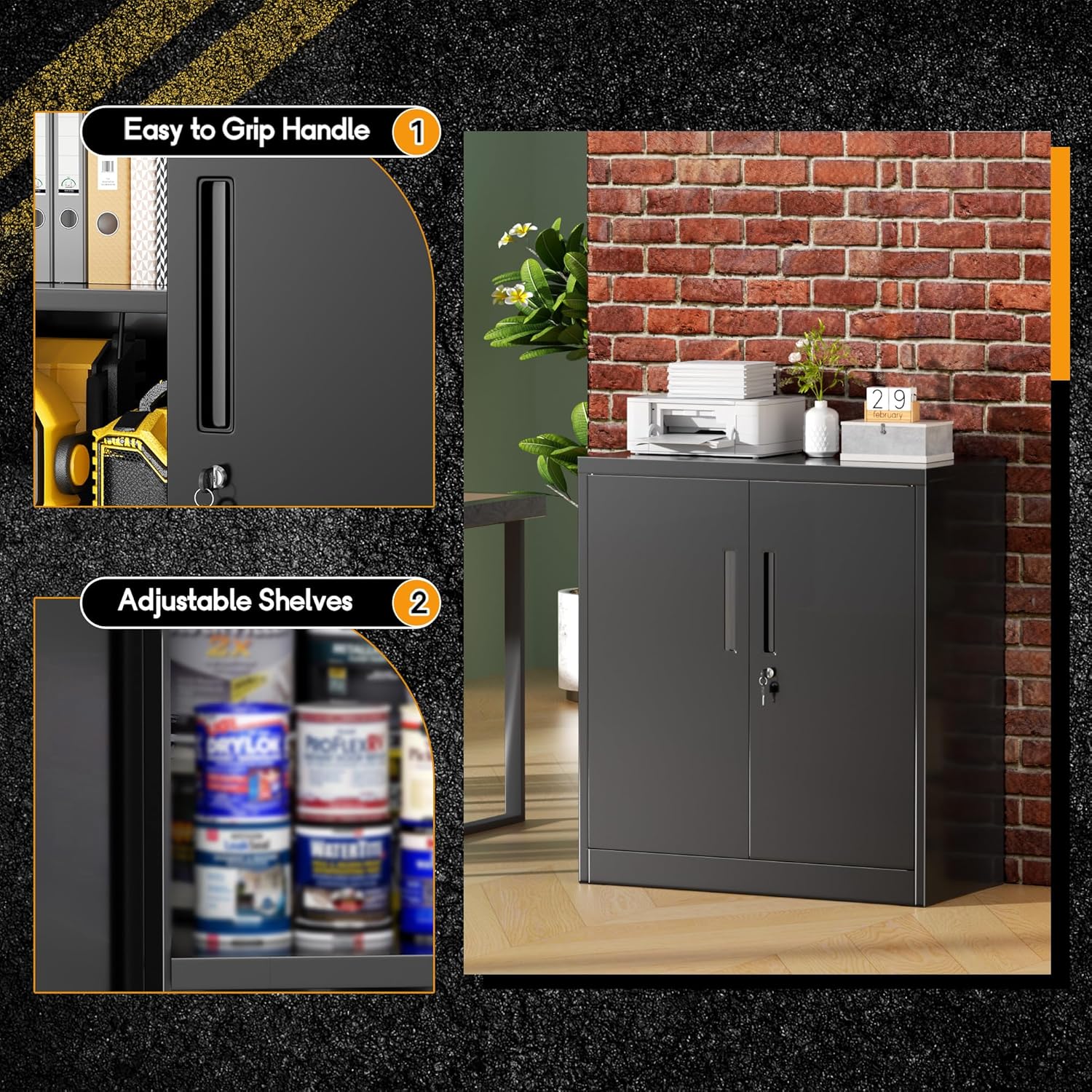 - [Easy Assemble]:Greenvelly is a professional seller of specialized black metal cabinets with doors and shelves.After years of research, we know that a number of our customers experience installation problems.Thus Metal storage cabinets provide paper and video assembly instructions,which we are constantly updating content . Even if you don’t have DIY experience, you could easily assemble it.