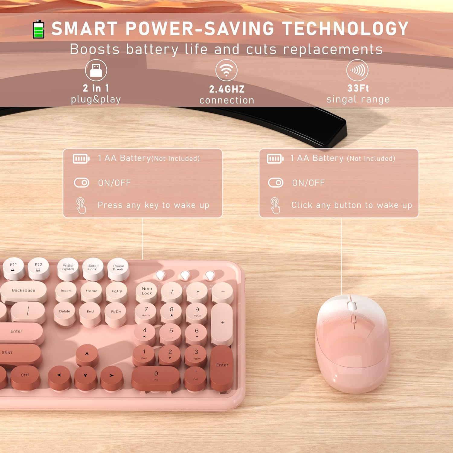 Wireless Keyboard and Mouse, Full-Size Retro Typewriter Keyboard with Round Keycaps, 2.4GHz for Windows, Mac, Laptop, PC, Desktop (Peach Gradient)