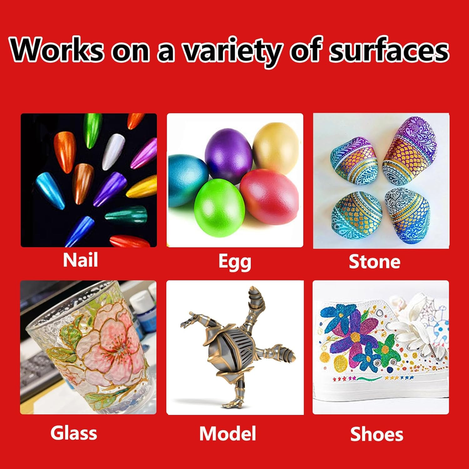 - Multi-Surface Versatility: Our sparkle metallic paint markers are versatile and can be used on a wide range of surfaces, including nail art, model coloring, silicone, fabric,canvas, black paper, metal, mugs, wood, DIY handmade decoration ect. Ideal for art and DIY crafts, these magic shimmer markers let you express your creativity on a wide