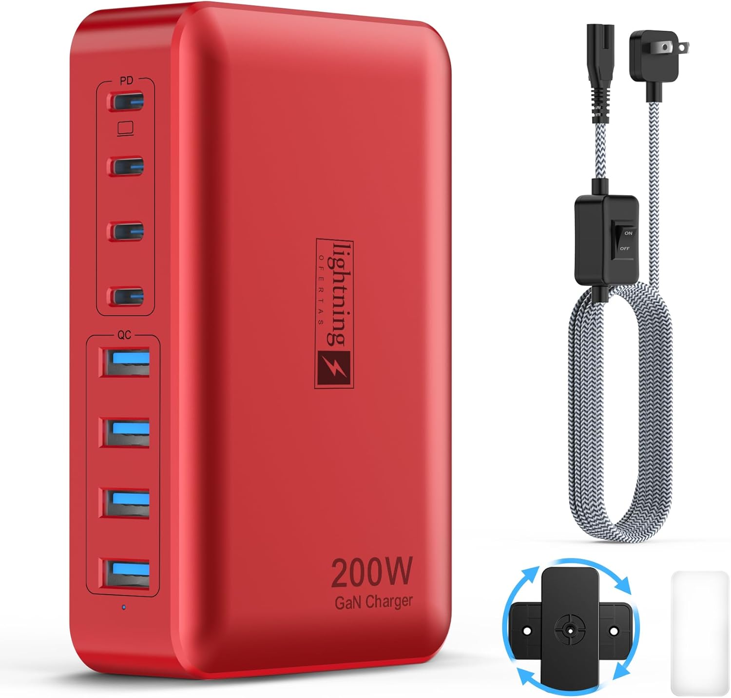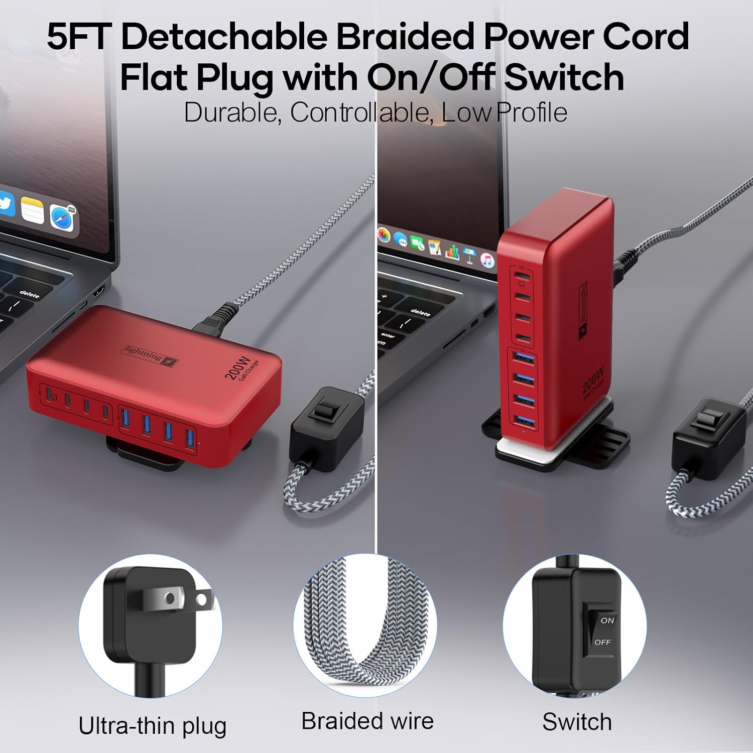 8-Port USB Charger Block 200W with Flat Plug, Braided Power Cord, and On/Off Switch- USB Charging Hub for iPhone, iPad, MacBook and More- 65W C Port Power Adapter for Laptops