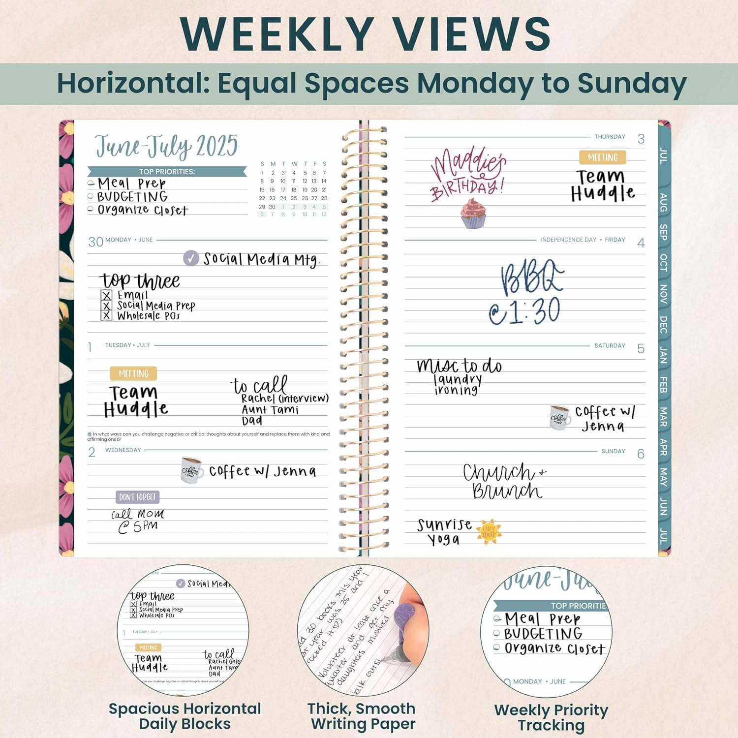 - WEEKLY & MONTHLY LAYOUT FOR EASY PLANNING! Featuring spacious weekly planner pages and two-page monthly planner spreads, this day planner runs from July 2025 through July 2026āgiving you over 365 days to track appointments, tasks, and goals.