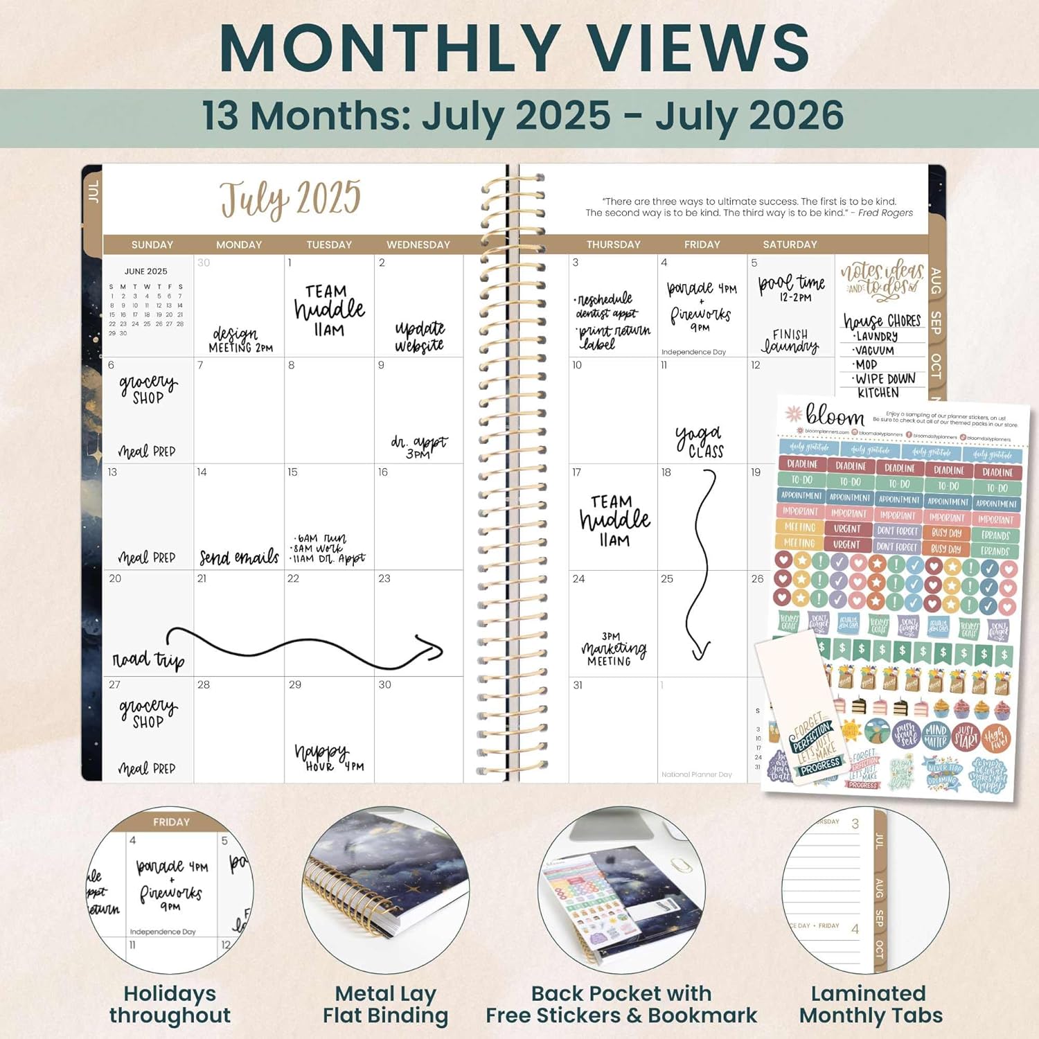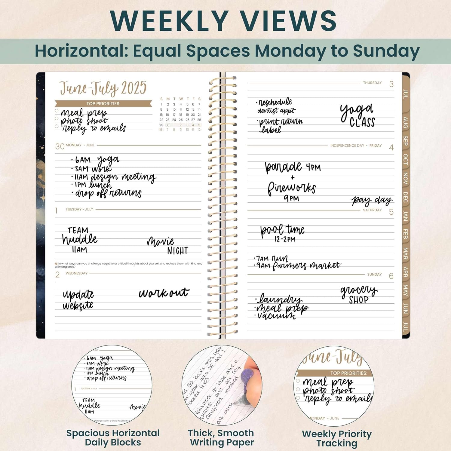 - EFFORTLESS WEEKLY & MONTHLY LAYOUT: This day planner features two-page monthly planner spreads and spacious horizontal weekly layouts, running from July 2025 through July 2026âperfect for tracking your tasks, deadlines, and appointments.