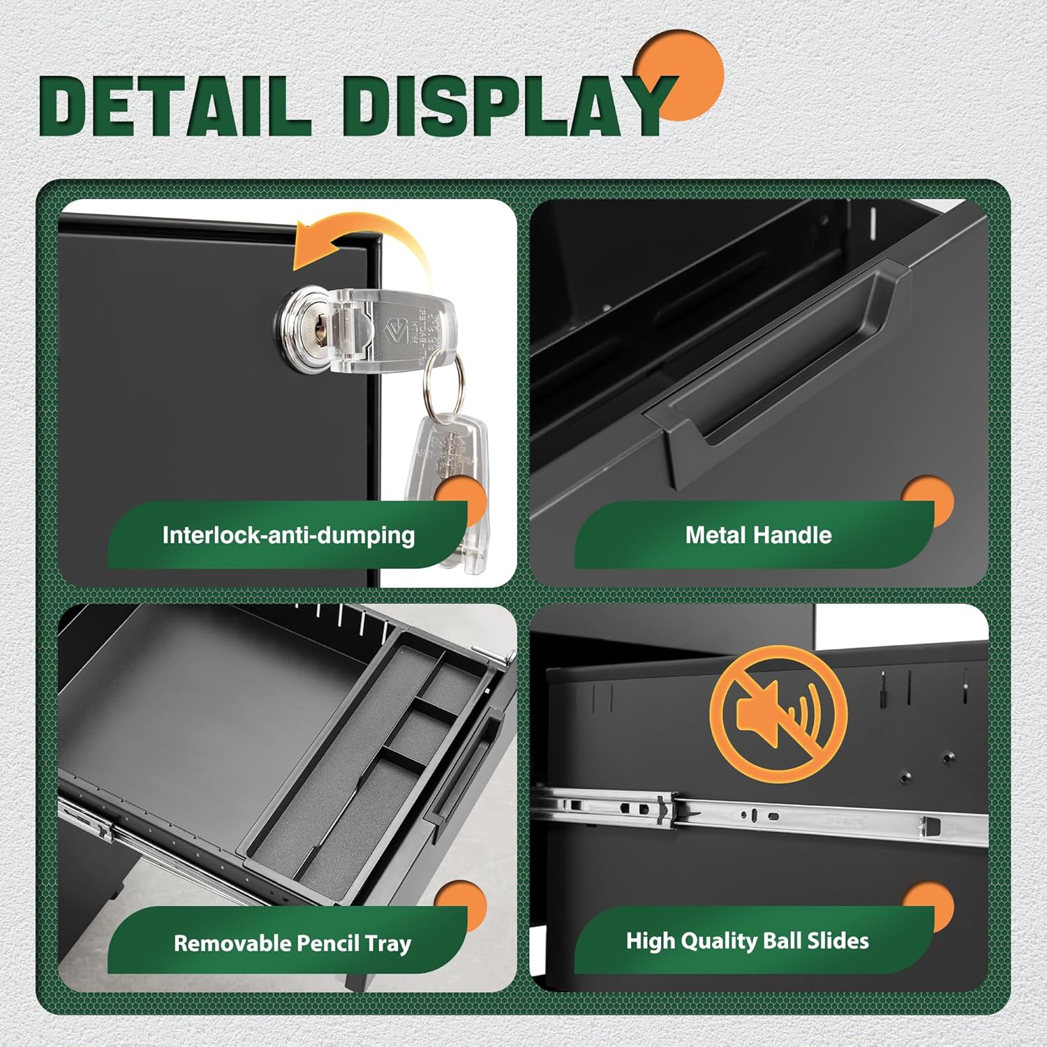 - Metal Material:File cabinet is made of 0.8mm thick steel,whole is solid and does not deform, and it is stronger than wooden filing cabinets in terms of firmness, durability, moisture resistance, and fire protection