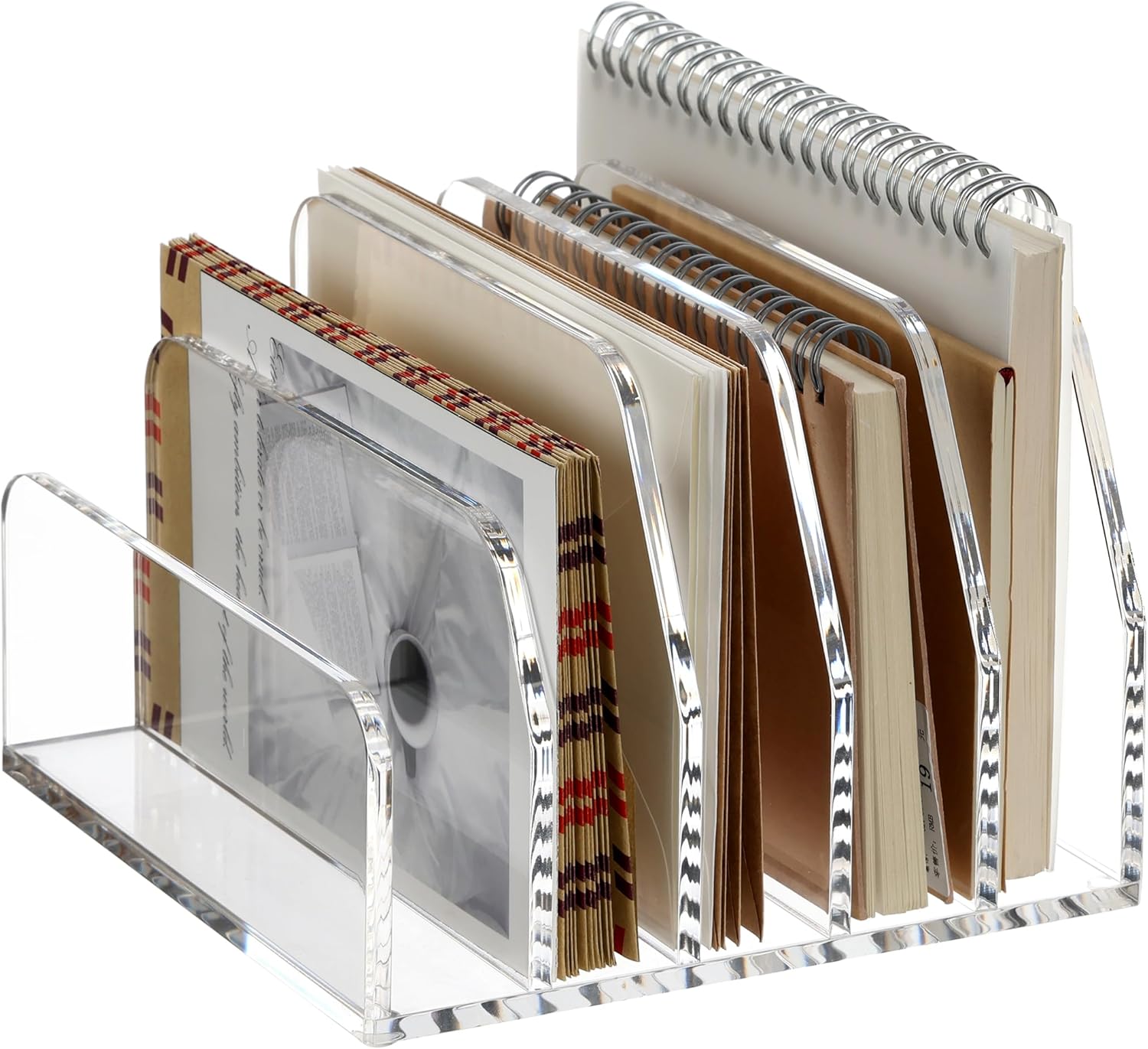 - 🗂️5 COMPARTMENT SPACE HIGH CAPACITY FILE SORTOR: Our acrylic file sorter measures 6.5x 6.7 x 4.57inches with spacious storage capacity, providing ample storage and sorting space for your emails and files. It is the perfect desktop organizer for organizing files, magazines, documents, letters, books, binders, folders, emails, eye shadow trays and more.