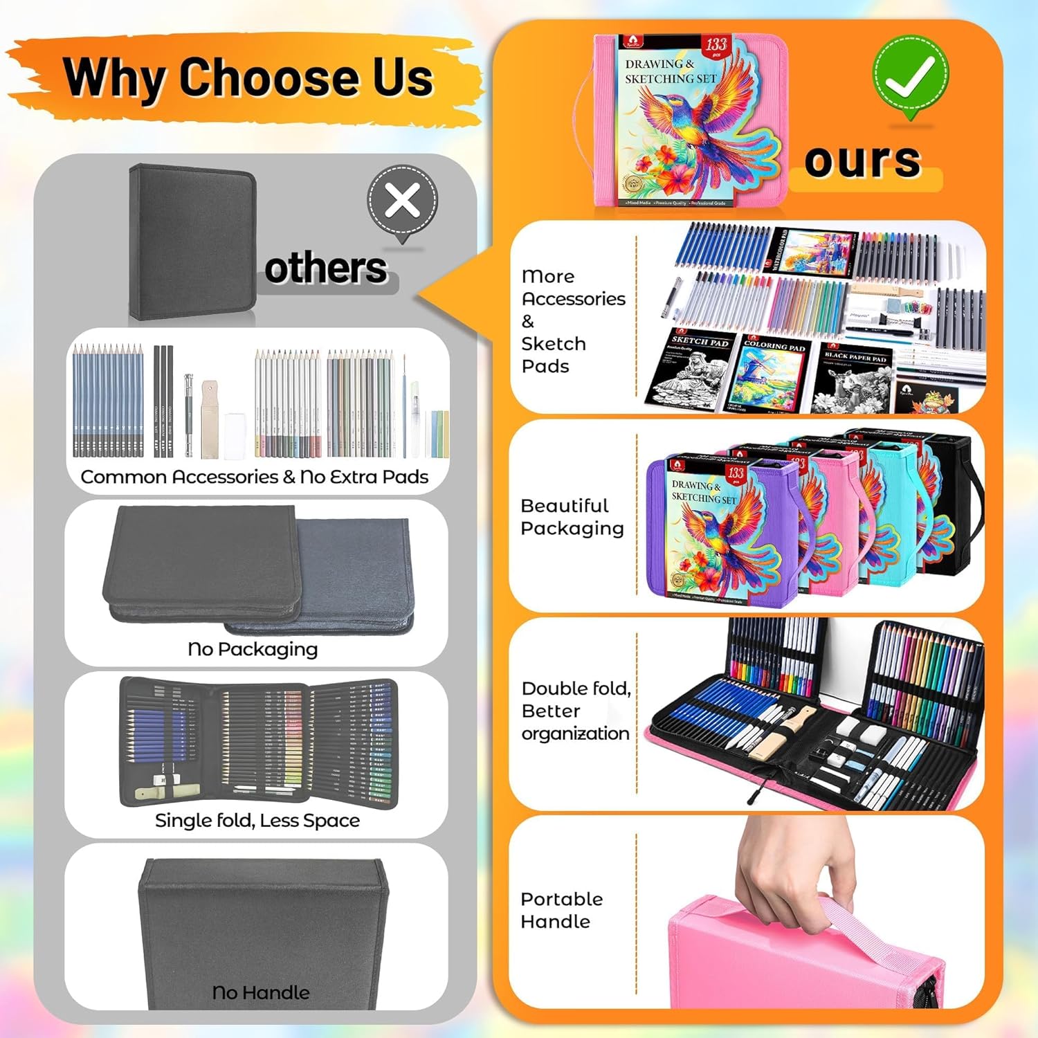 - 133 PCS Professional Drawing Kit Sketching Supplies: All you need are in this portable art case whether you are a professional or a beginner. It includes all the art supplies, specially added sketchbook, coloring book, watercolor pad and black paper pad. Perfect for drawing, sketching, shading, blending, layering and adult coloring books.With our professional drawing supplies kits, let your imagination flow and bring your ideas to your artistic journey