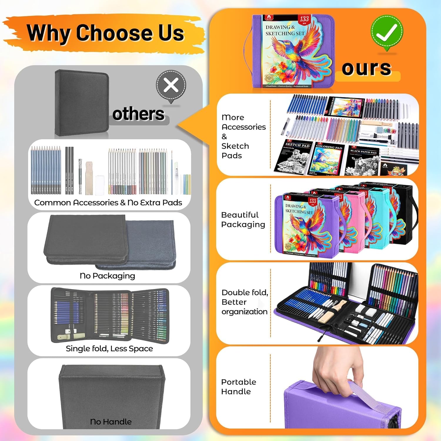 - 133 PCS Professional Drawing Kit Sketching Supplies: All you need are in this portable art case whether you are a professional or a beginner. It includes all the art supplies, specially added sketchbook, coloring book, watercolor pad and black paper pad. Perfect for drawing, sketching, shading, blending, layering and adult coloring books.With our professional drawing supplies kits, let your imagination flow and bring your ideas to your artistic journey