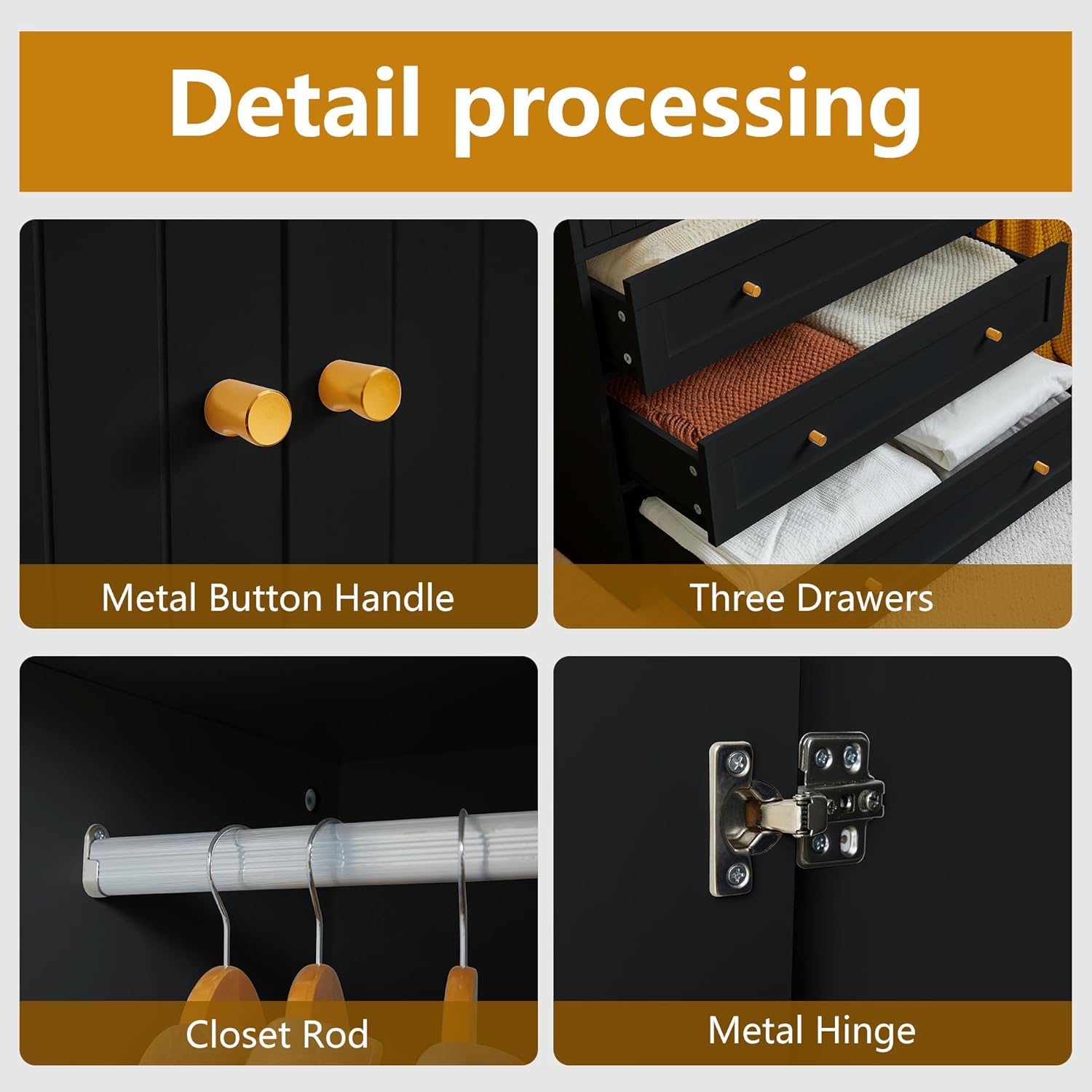 - 【Elegant Style】This wooden wardrobe is simple, it combines black panels with gold handles to create luxury charm.This large wardrobe matches well with various house decors.