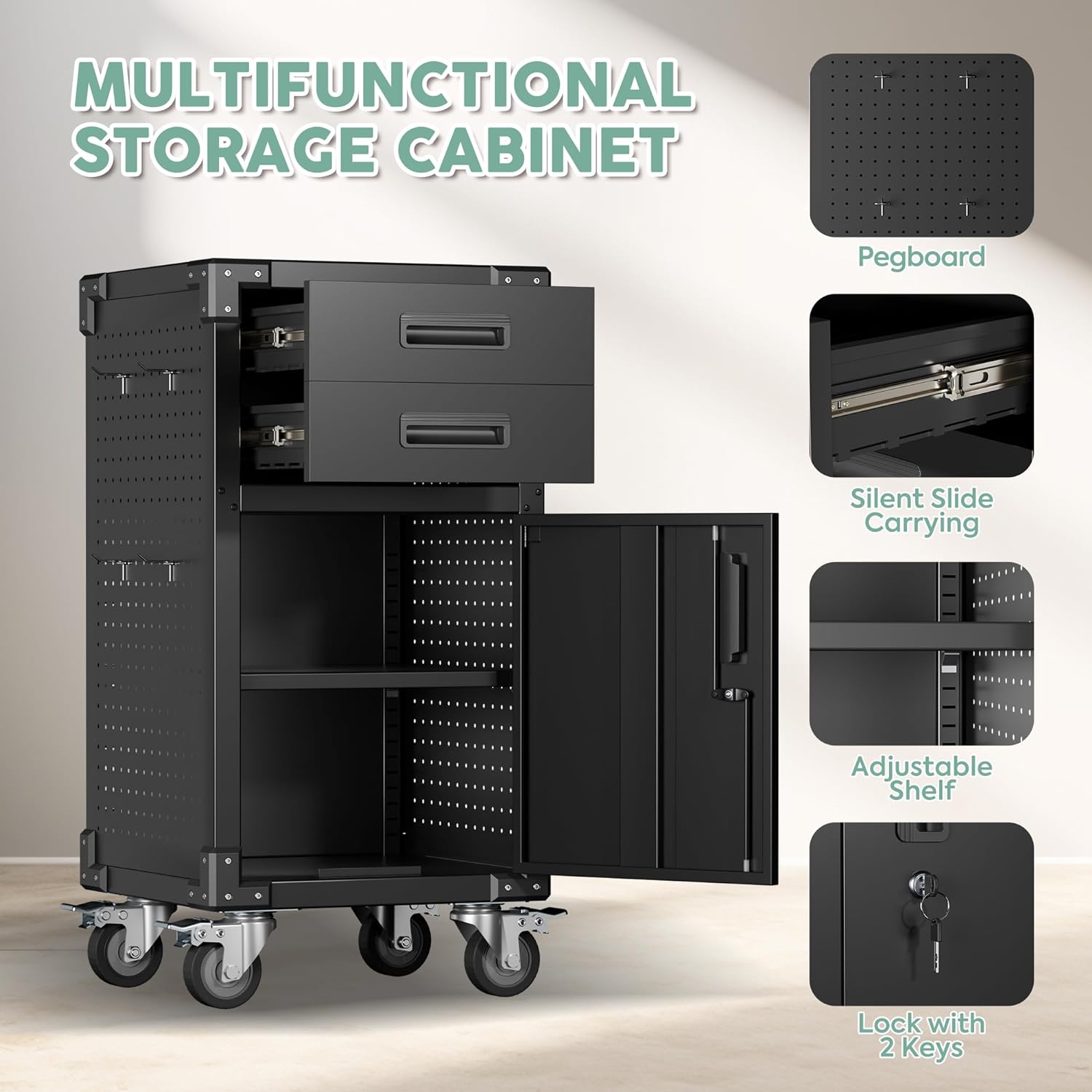 Garage Storage Cabinet, Metal Storage Cabinet with 1 Locking Door and 2 Drawers, Heavy Duty Rolling Workbench Table with Wheels and Pegboards for Garage, Office and Tool Room