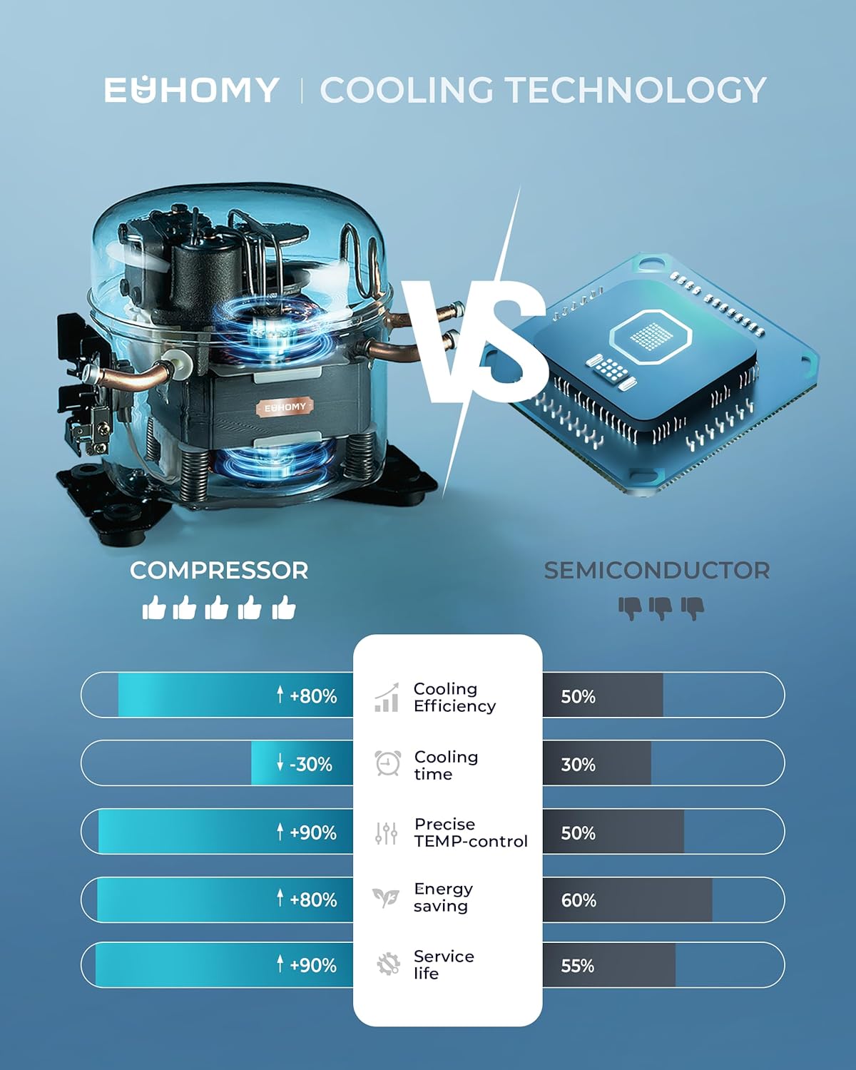 - 【Stable temperature】This wine chiller features one-touch temperature control, ranging from 40°F to 61°F. Unlike traditional semiconductor refrigeration, this mini refrigerator uses advanced compressor refrigeration technology that ensures stable temperature control and keeps beverages in optimal condition at all times, no matter how the environment changes.