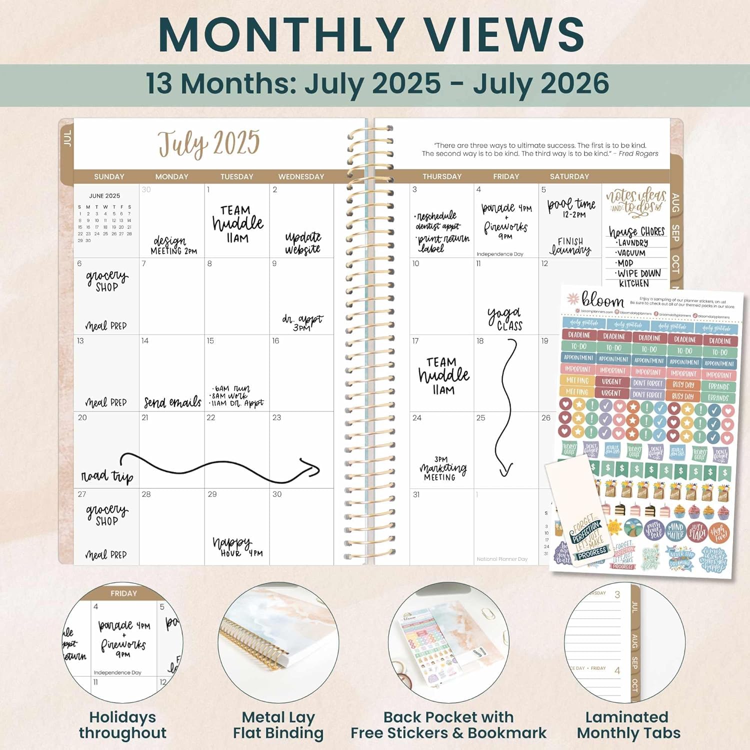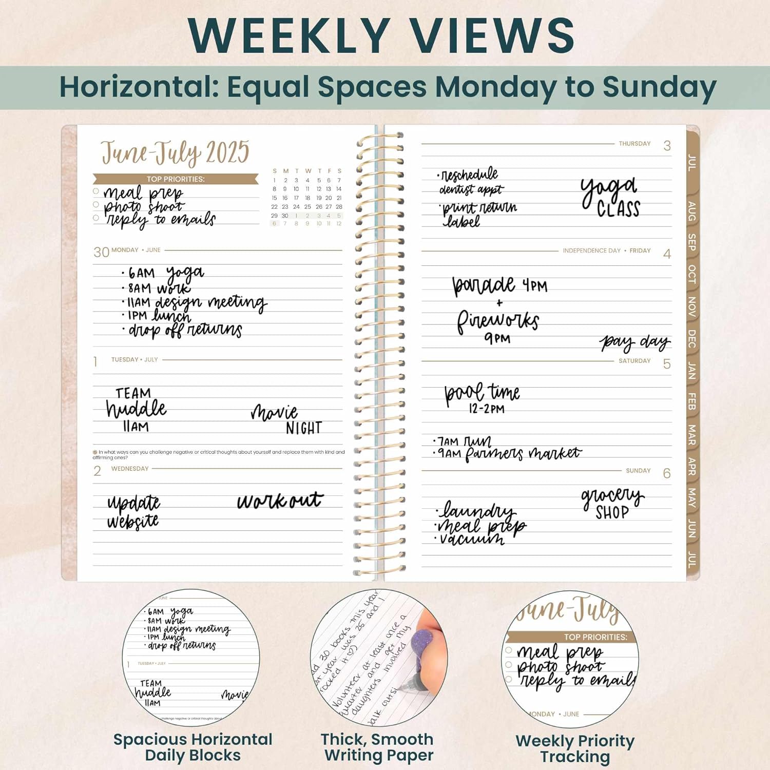 - EFFORTLESS WEEKLY & MONTHLY LAYOUT: This day planner features two-page monthly planner spreads and spacious horizontal weekly layouts, running from July 2025 through July 2026âperfect for tracking your tasks, deadlines, and appointments.