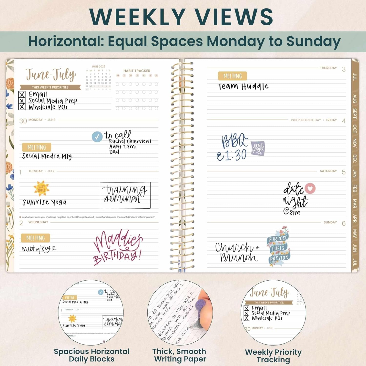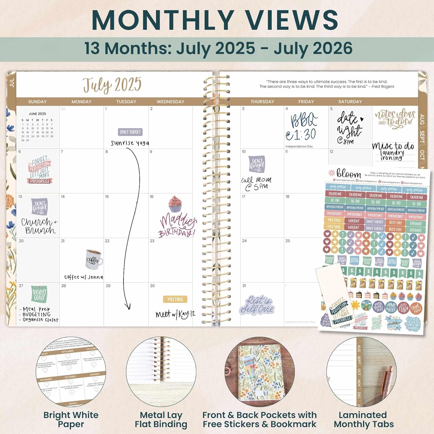 - DELUXE DESIGN ELEMENTS: This planner 2025-2026 has soft yet durable covers, monthly tabs, and 100gsm bright white, no-bleed paper. The metal spiral binding allows your planner to lay flat, and two vertical cover pockets provide a secure place for loose papers. Also includes a FREE magnetic bookmark and sticker sheet!