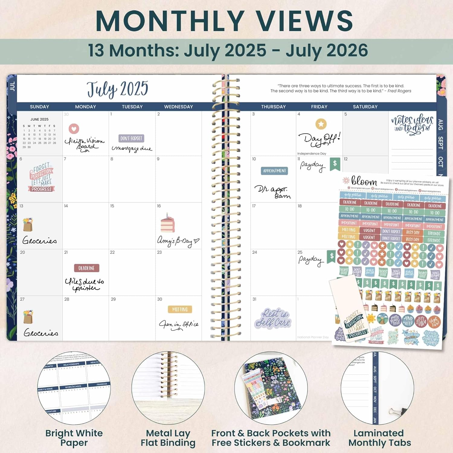 - PREMIUM FEATURES: Soft, lightweight covers made from thick cardstock with gloss film lamination, monthly tabs, deluxe 100gsm bright white bleed-resistant paper, recyclable metal lay-flat spiral binding, vertical front and back inside storage pockets, and FREE magnetic bookmark and stickers now included!