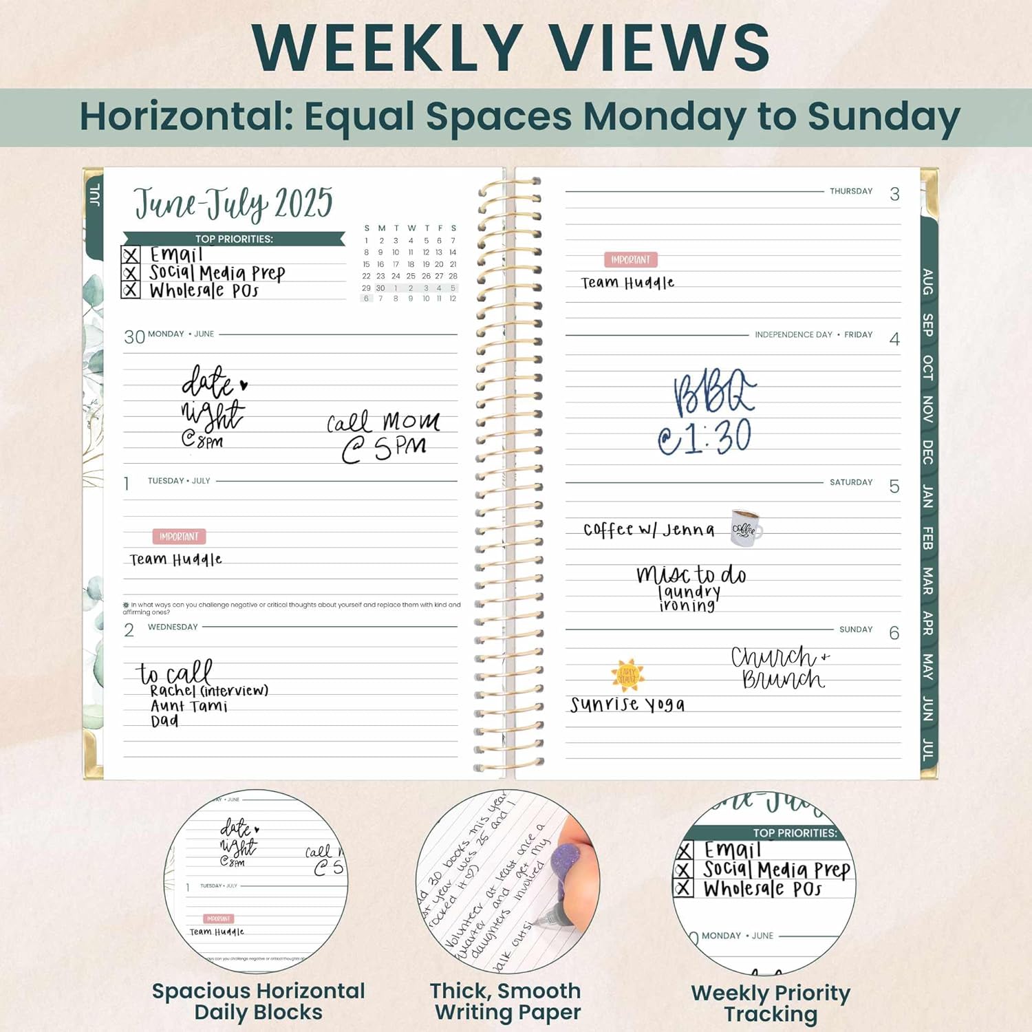 - LAYOUT: 2 page monthly overview spreads and spacious weekly views run academic year, JULY 2025 through JULY 2026 -- 365+ days of planning!