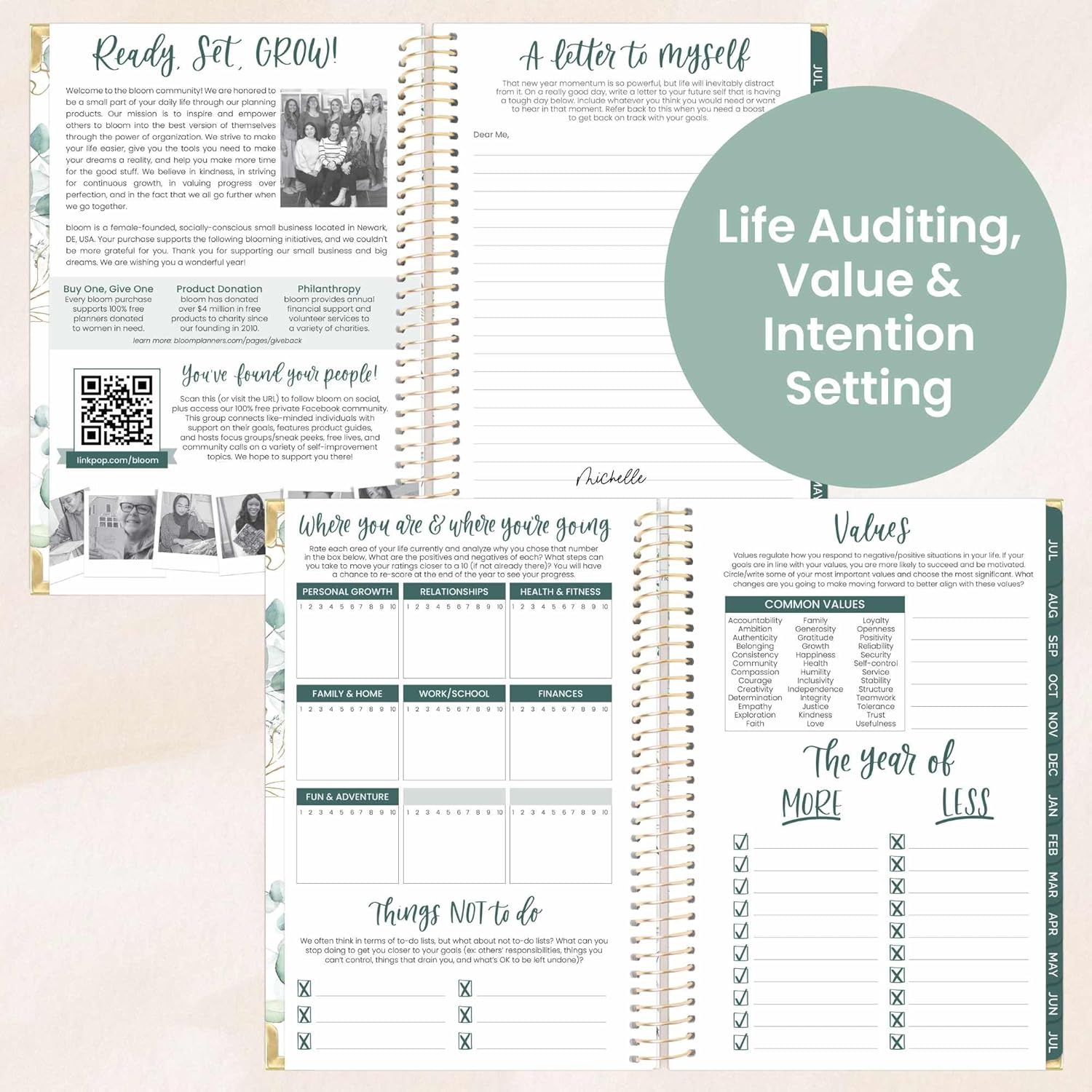- BONUS: Packed with life coaching worksheets and inspirational features to help you set and achieve all of your goals for the year: personal mission statement prompt and yearly goal setting page, weekly scheduling templates, values page, habit tracking, vision board, monthly spending log, 13 notes pages, inspirational quotes, monthly challenges, and more!