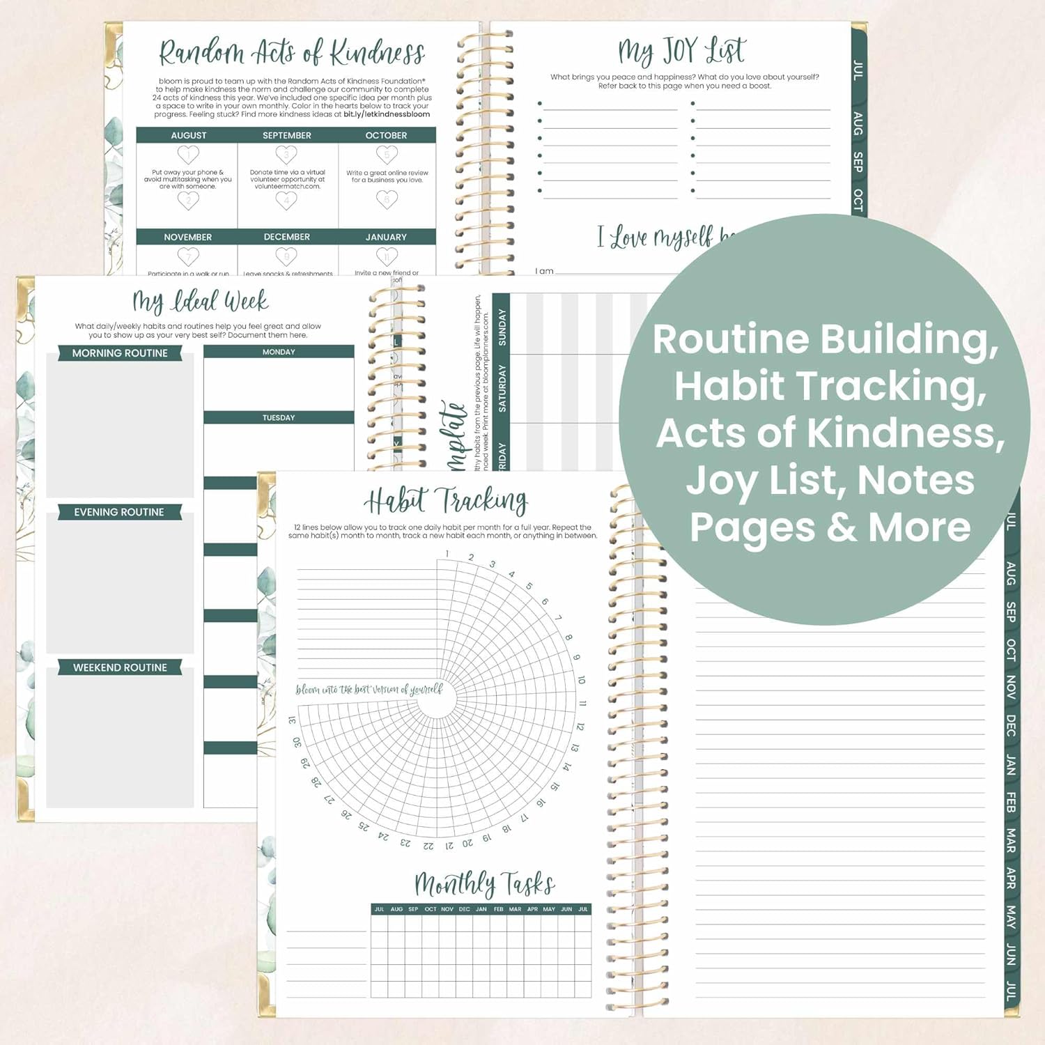 - PREMIUM FEATURES: Deluxe hard cover made of sturdy chipboard with metal reinforced corners, FREE magnetic bookmark and sheet of stickers, monthly tabs, 100gsm bright white bleed-resistant paper, recyclable metal lay-flat spiral binding, and a horizontal back inside pocket