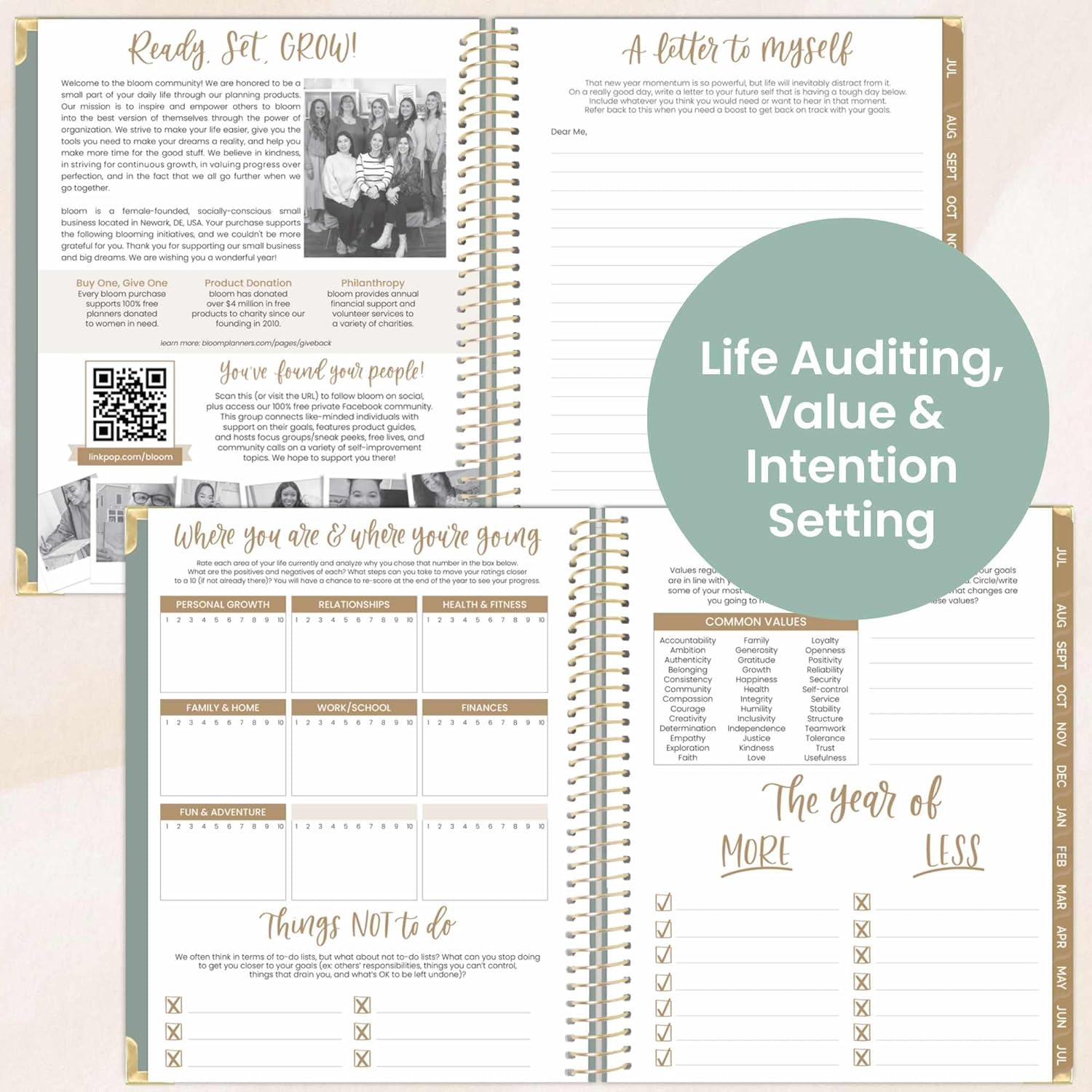 - BONUS ELEMENTS: Packed with life coaching worksheets and inspirational features to help you set and achieve all of your goals for the year: personal mission statement prompt and yearly goal setting page, weekly scheduling template, values page, habit tracking, vision board, monthly spending log, 13 notes pages, inspirational quotes, monthly challenges, and more!