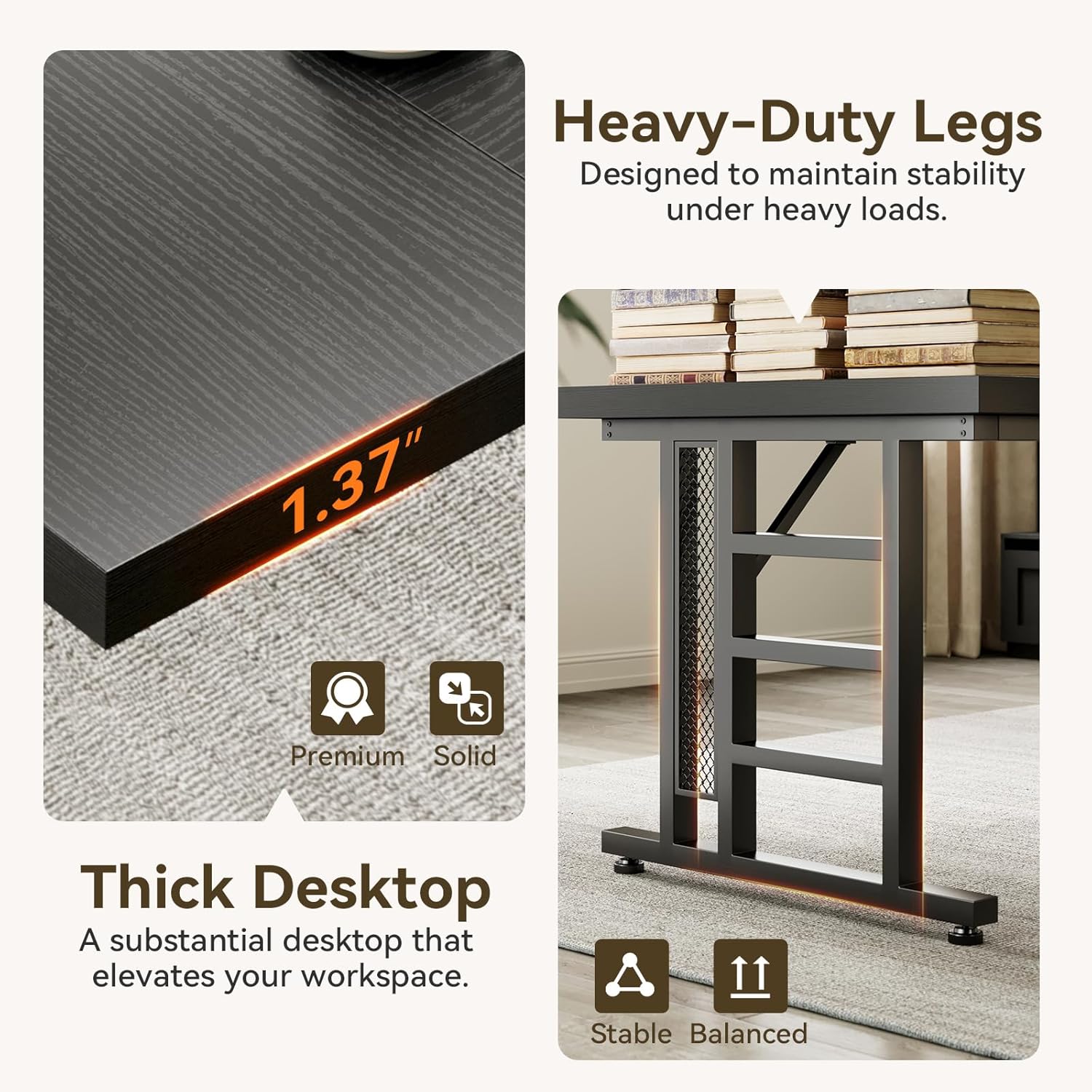 - ăHeavy-Duty, Sturdy Desk Frame for DurabilityăBuilt with a 1.37-inch thick engineered wood surface, this desk offers exceptional strength. The reinforced steel frame supports multiple monitors, printers, or heavy equipment. Adjustable leg pads keep your desk steady on uneven floors, ideal for home or writing desks.