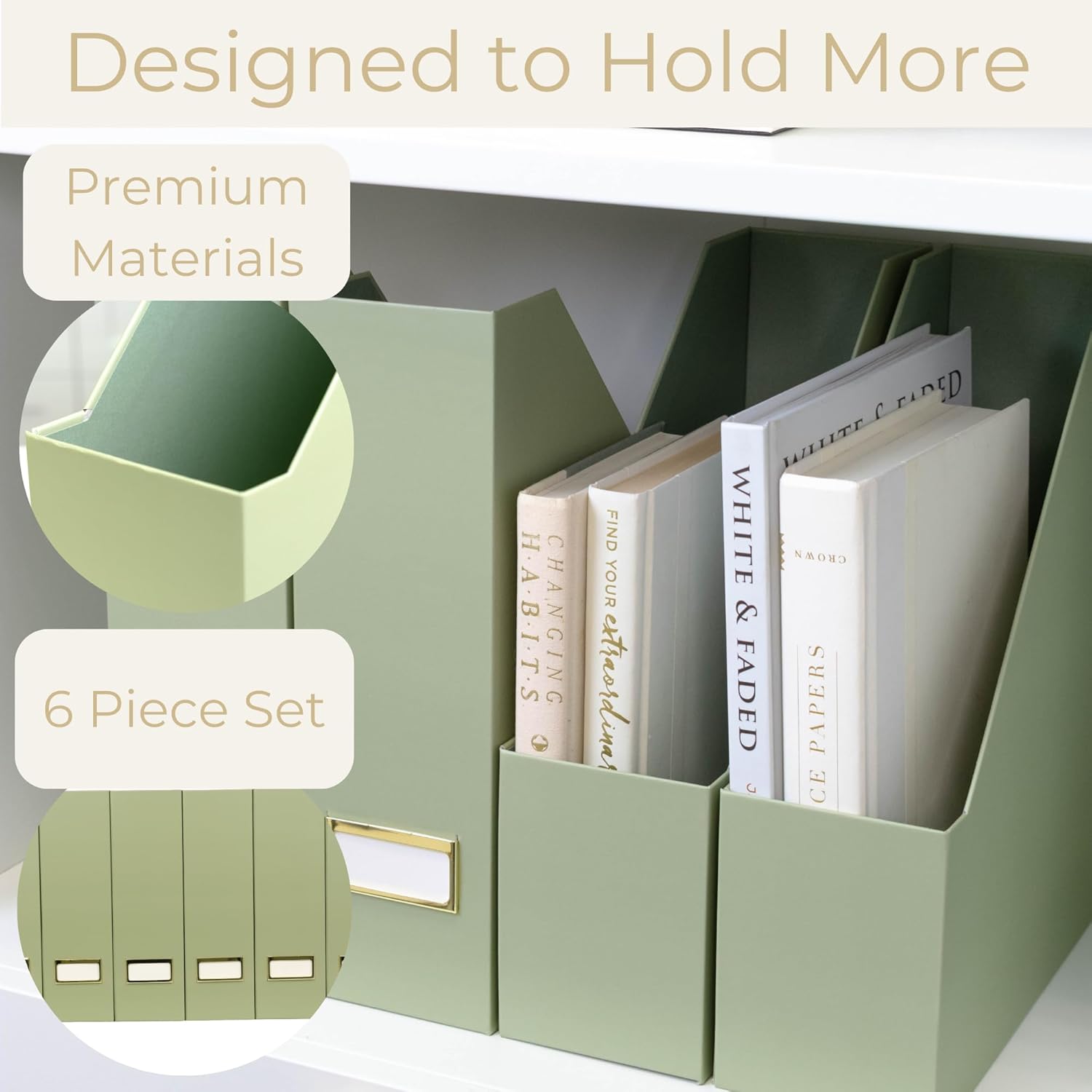 BLU MONACO Set of 6 Foldable Magazine File Holders in Earth Green – Sturdy Cardboard Vertical Organizers with Label Holders – Office File Storage Box, Desk Organizer, Paperwork and Document Holder