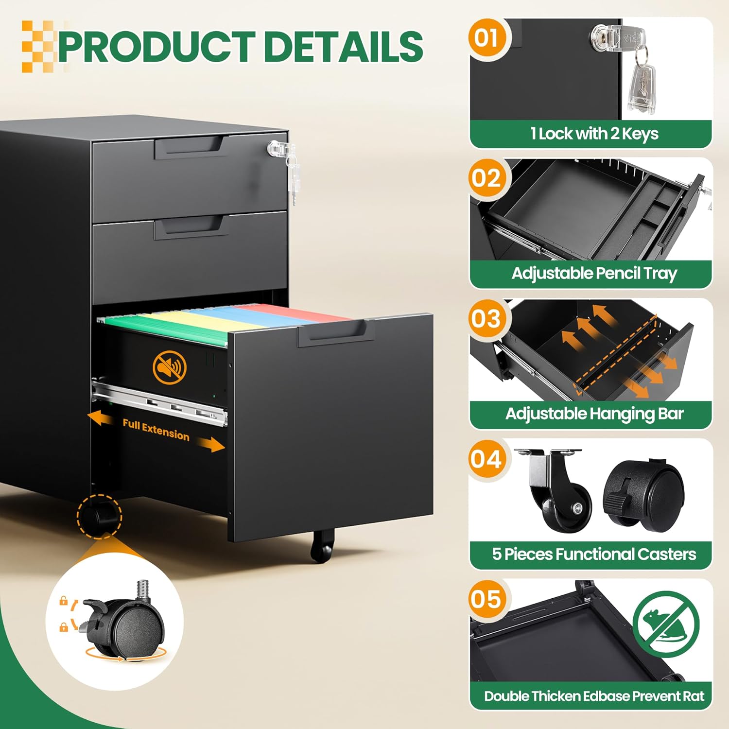 - 【Easy to Move】: The file cabinet is equipped with 4 lockable swivel casters and 1 anti-tilt Caster in front . Middle caster prevents tipping over when all drawers opened at the same time. You can move file cabinet smoothly with 5 rolling casters to anywhere you want.