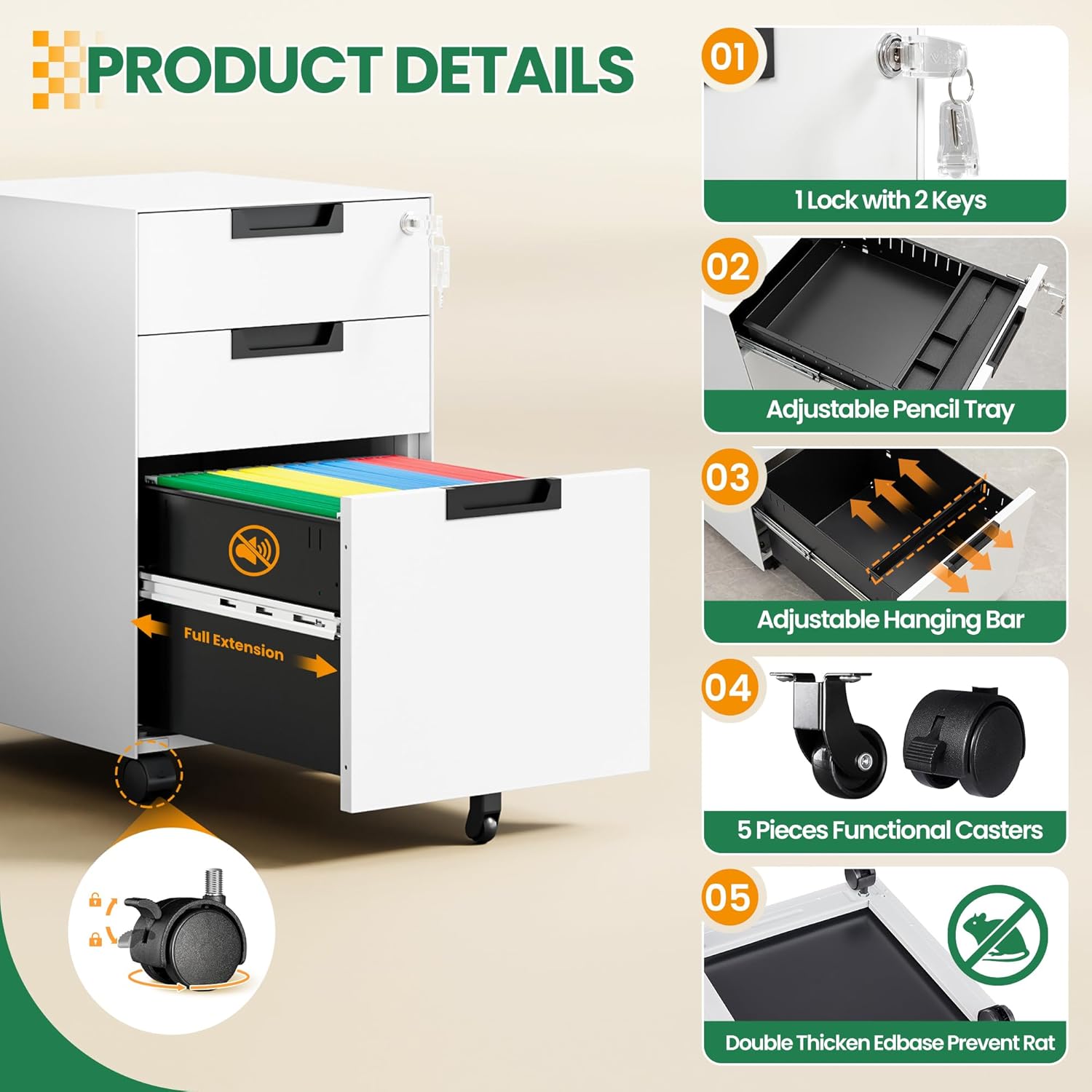 - 【Easy to Move】: The file cabinet is equipped with 4 lockable swivel casters and 1 anti-tilt Caster in front . Middle caster prevents tipping over when all drawers opened at the same time. You can move file cabinet smoothly with 5 rolling casters to anywhere you want.