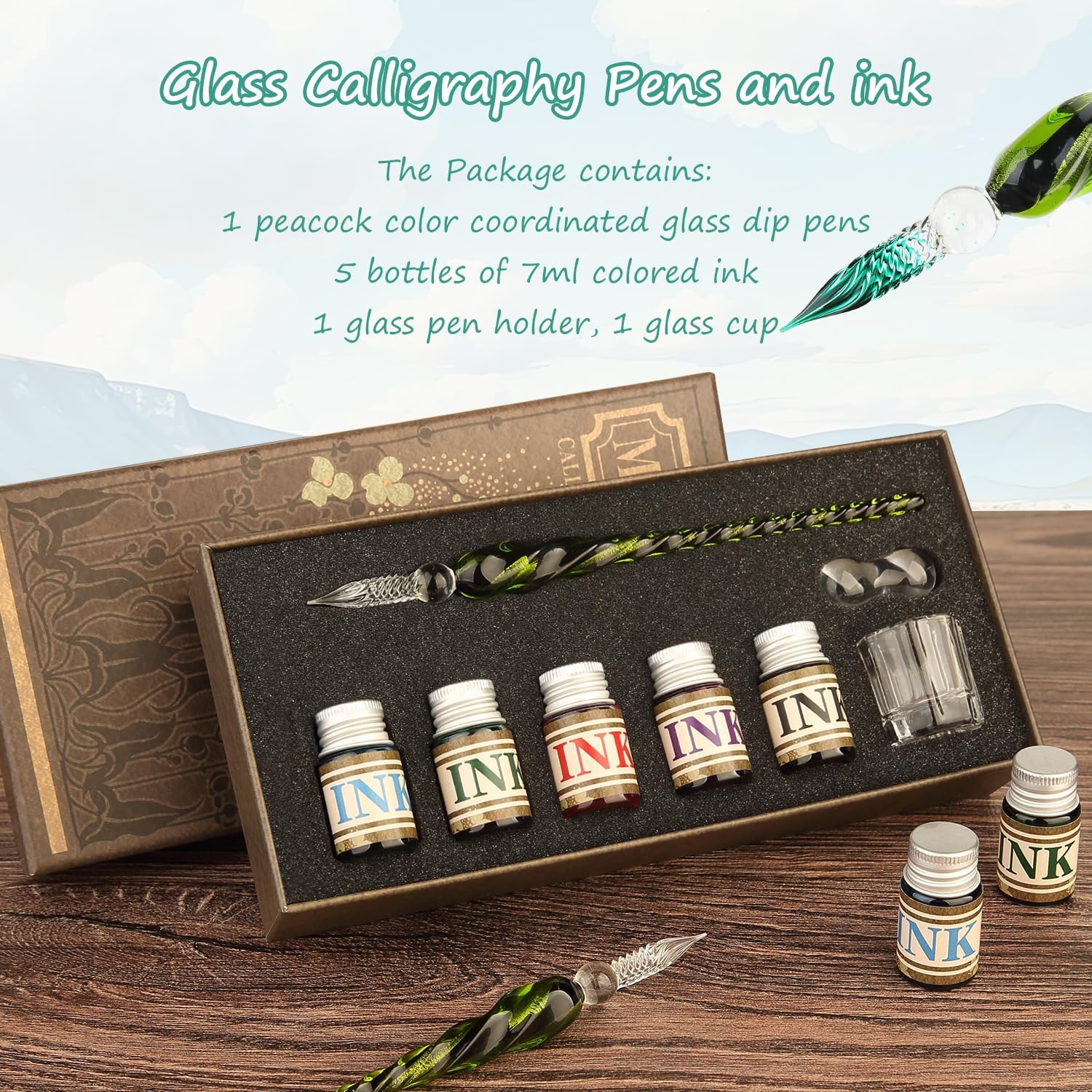 - ❤SUPERIOR HANDMADE CALLIGRAPHY SET: Perfect calligraphy pen set for beginners and advanced calligraphers. mancola glass dip pen set includes 1 glass pens, 5 bottles of different color inks. 1 Pen Holder,1 Cleaning Cup .Glass pen made of high borosilicate puffco glass, crystal glass material, excellent quality and craftsmanship . Looks very exquisite and beauty.