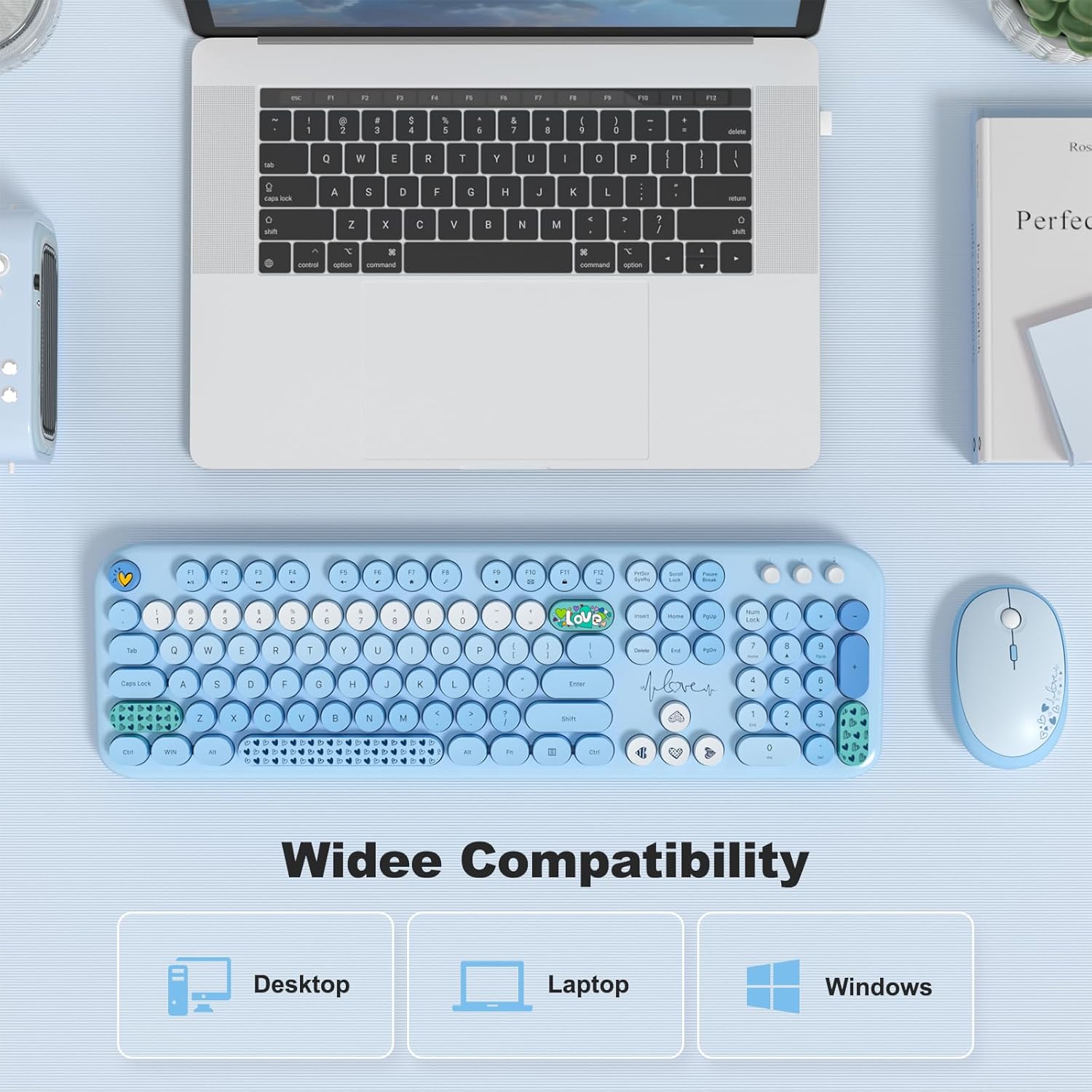 Wireless Keyboard and Mouse Combo, MOWUX Full Size Typewriter Retro Round Computer Keyboard, Cute Optical Mouse Wireless, Plug and Play, for Laptop, PC, Computer - Blue Heart