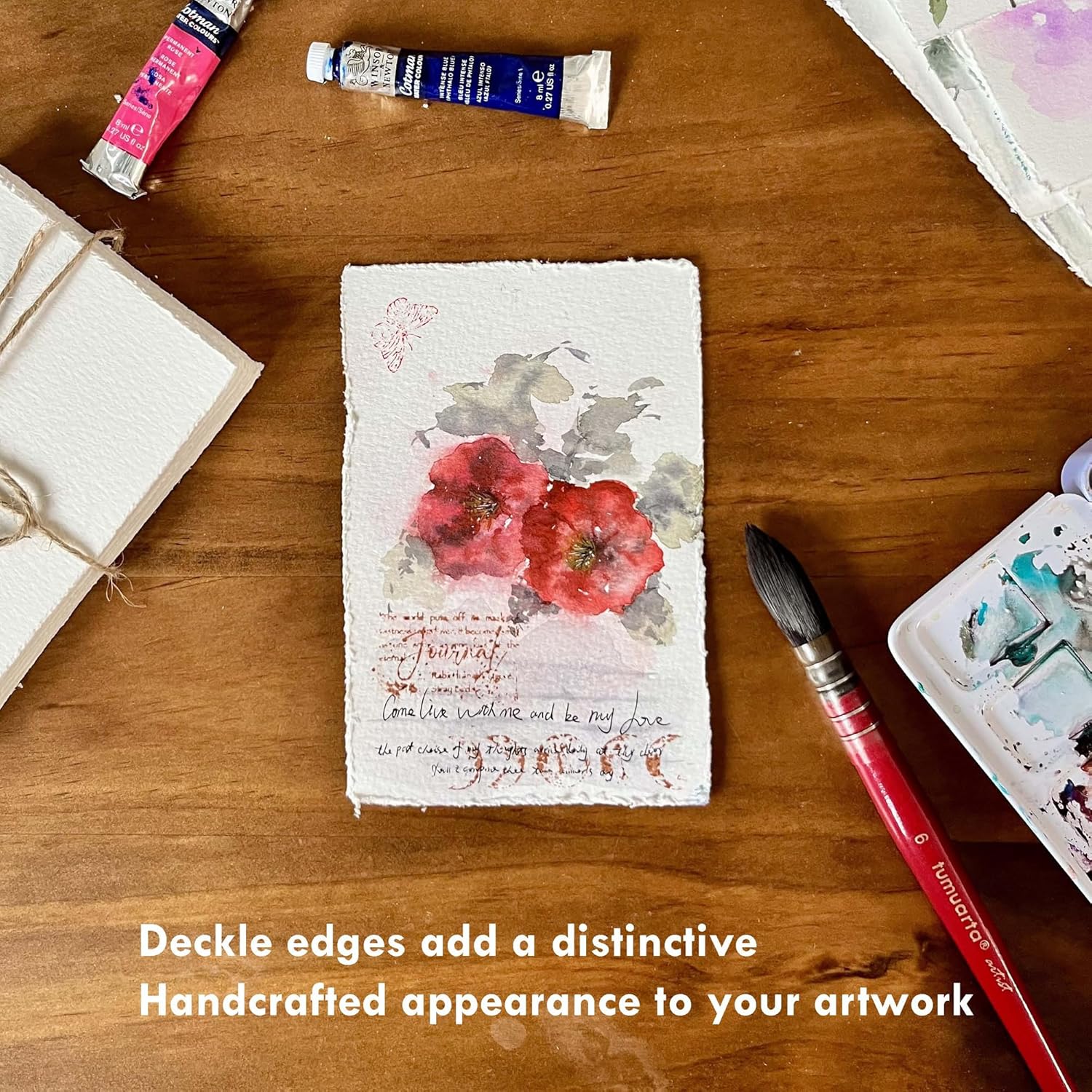 Deckle Edge Watercolor Paper, 100% Cotton, 140 LB, 300 GSM, 4x6”, 30 Sheets Mixed Media Paper for Dry & Wet Technique, Acid Free, tumuarta Blank Cards is Perfect for Greeting Cards & Thank You Notes