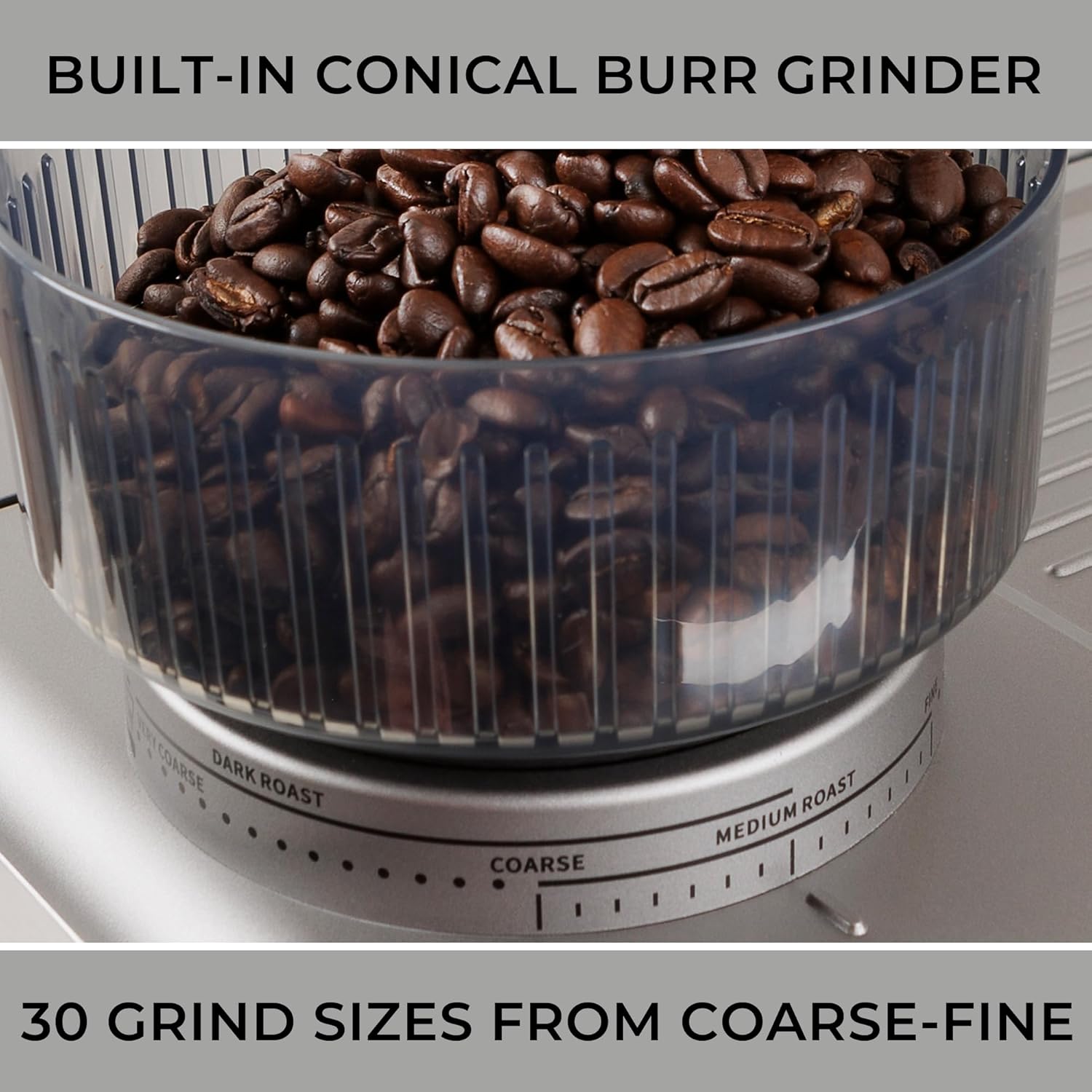 - PRECISION DOSE CONTROL GRINDING - the built-in conical burr grinder with 30 grind size settings ensures you get the precise amount of freshly ground coffee required for each brew. this feature enhances the flavor and consistency of your espresso, providing a perfect grind every time.