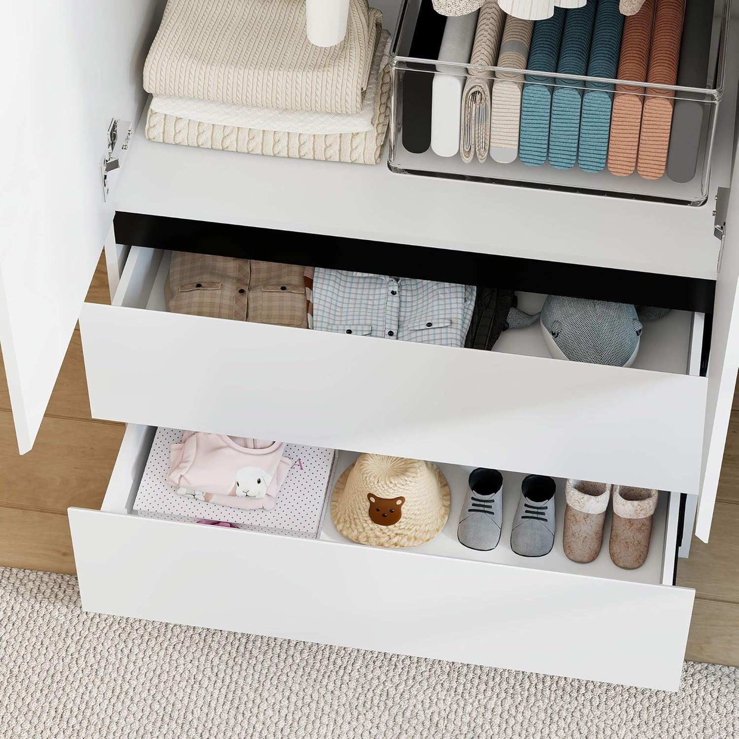 - Elegant Appearance, Safety-Focused Design: The design of the wardrobe closet with drawers pays attention to every detail. The sleek appearance combined with rounded corners not only enhances its aesthetic appeal but also minimizes the risk of bumps and injuries. This makes it particularly suitable for families with children, ensuring safe use for all family members. Additionally, the height of the white closet is ergonomically designed, making it easy to access items and enhancing the user experience. The overall design is elegant and refined, adding a touch of sophistication and grace to any space it occupies.