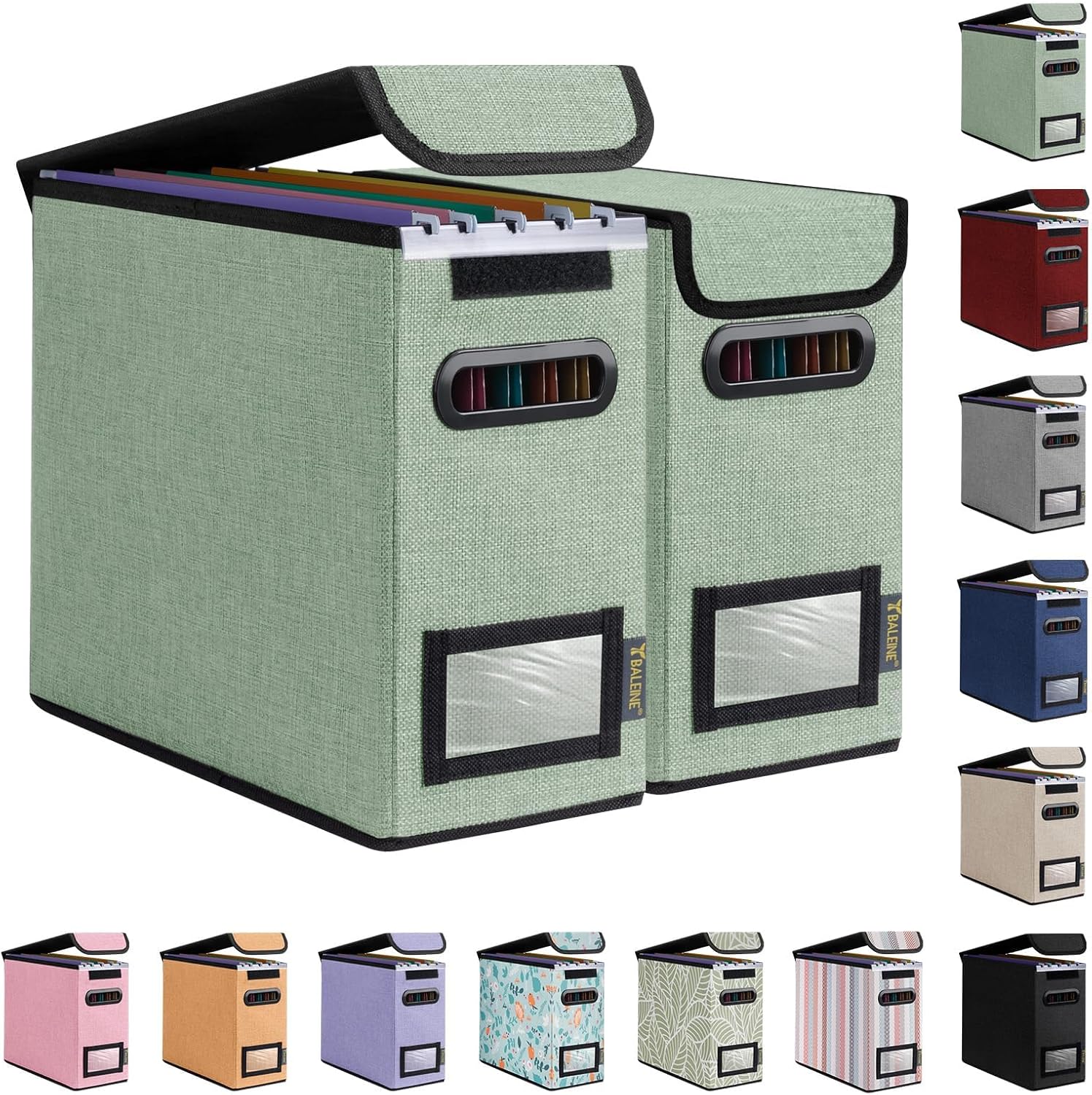 BALEINE File Organizer Box with Lid, Collapsible File Folder Organizer with Plastic Slide, Hanging File Folder Box for Office Document Storage (2 Pack, Green, S)