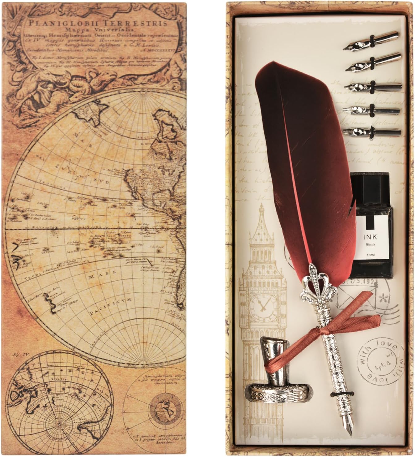 Flylin Retro Feather Pen Set, Calligraphy Fountain Dip Quill Pen, 5 Replacement Nibs, Red Ink, Perfect for Calligraphy