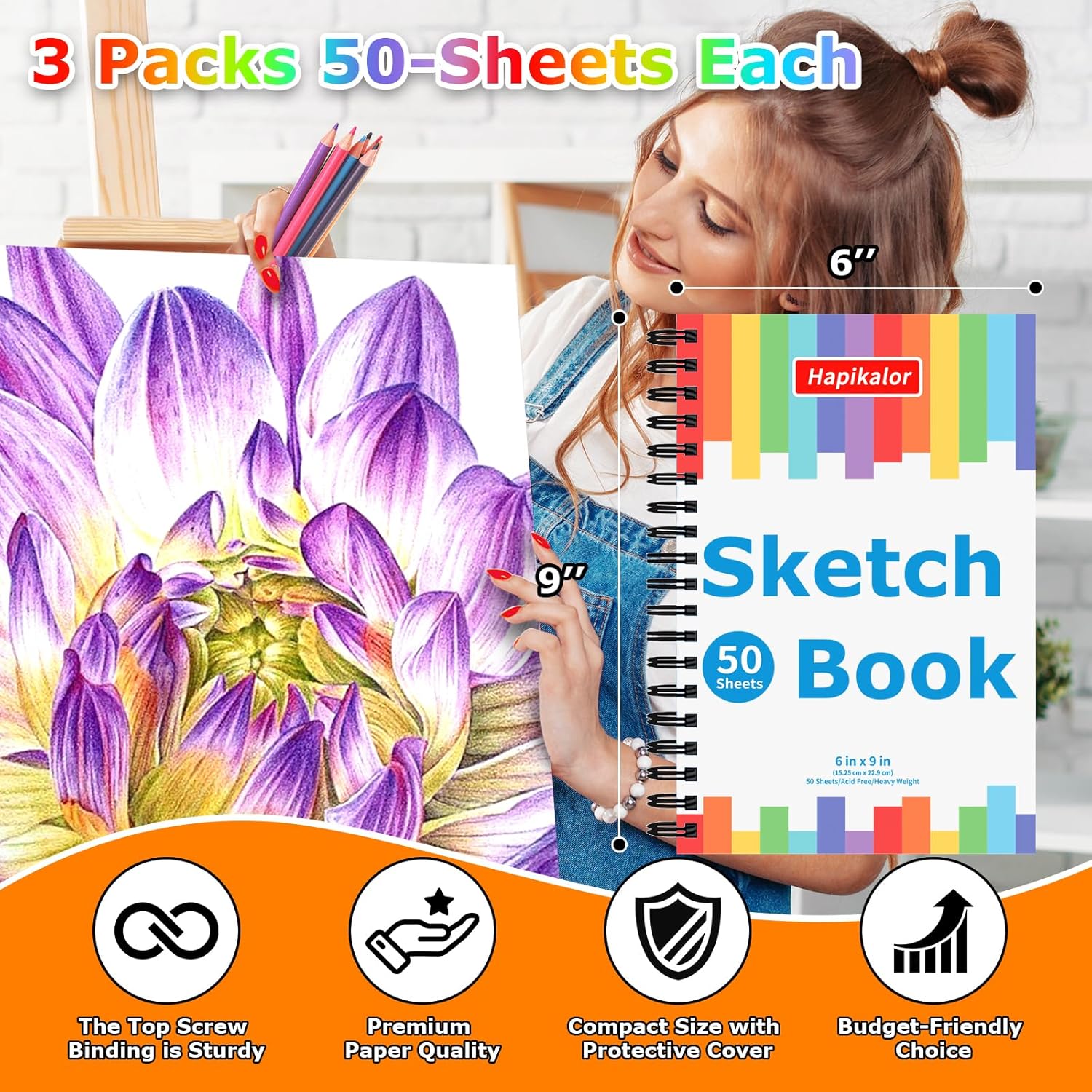 - 【Premium Paper Quality】Professional Sketch Book Drawing Pads. The Hapikalor Drawing Paper Pad set is a 3-pack of pads that each have 50 sheets of premium heavy-weight bond paper. Each sheet measures 0.25" H x 9" W x 6" L, with 50 sheets in each pad. We have designed this kids drawing pad with pages that are easy to remove from the pad with little tearing. This sketchpad for kids is made with heavy-duty paper, which makes it great for sketching, drawing, illustrating, painting, writing.
