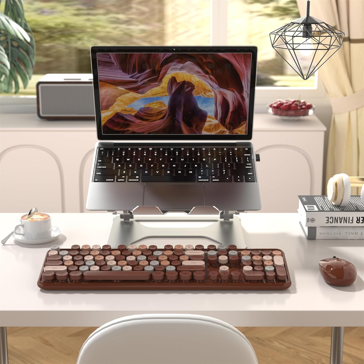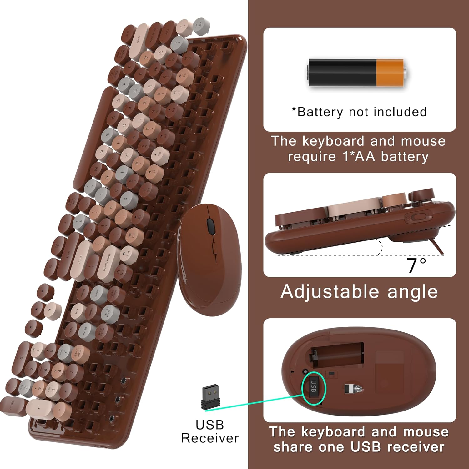 Colorful Wireless Computer Keyboard and Mouse Combo with Round Typewriter Keycaps, Retro Design, Power Switch, Ergonomic Design, 2.4GHz Wireless for Windows, Mac, PC(Coffee-Colorful)