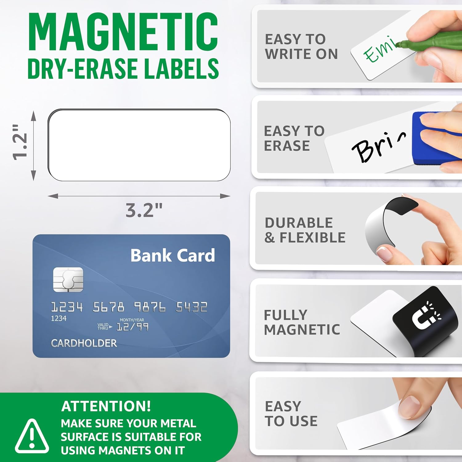 - Dry-Erase Surface - A reusable writing surface of our magnetic dry erase labels 3.2x1.2 in allowing you to jot down notes, names, tasks, or chores repeatedly without the need for paper wasting.
