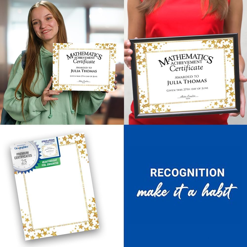 - CERTIFICATE PAPER FOR PRINTING & AWARDS: Celebrate achievements in style with Geographics Gold Star Award Certificates, featuring a dazzling holographic gold foil star design. These premium certificates, sized at 8.5” x 11”, are printed on high-quality 90 GSM paper, offering an elegant, affordable, and professional solution for award presentations, recognition programs, and special events.