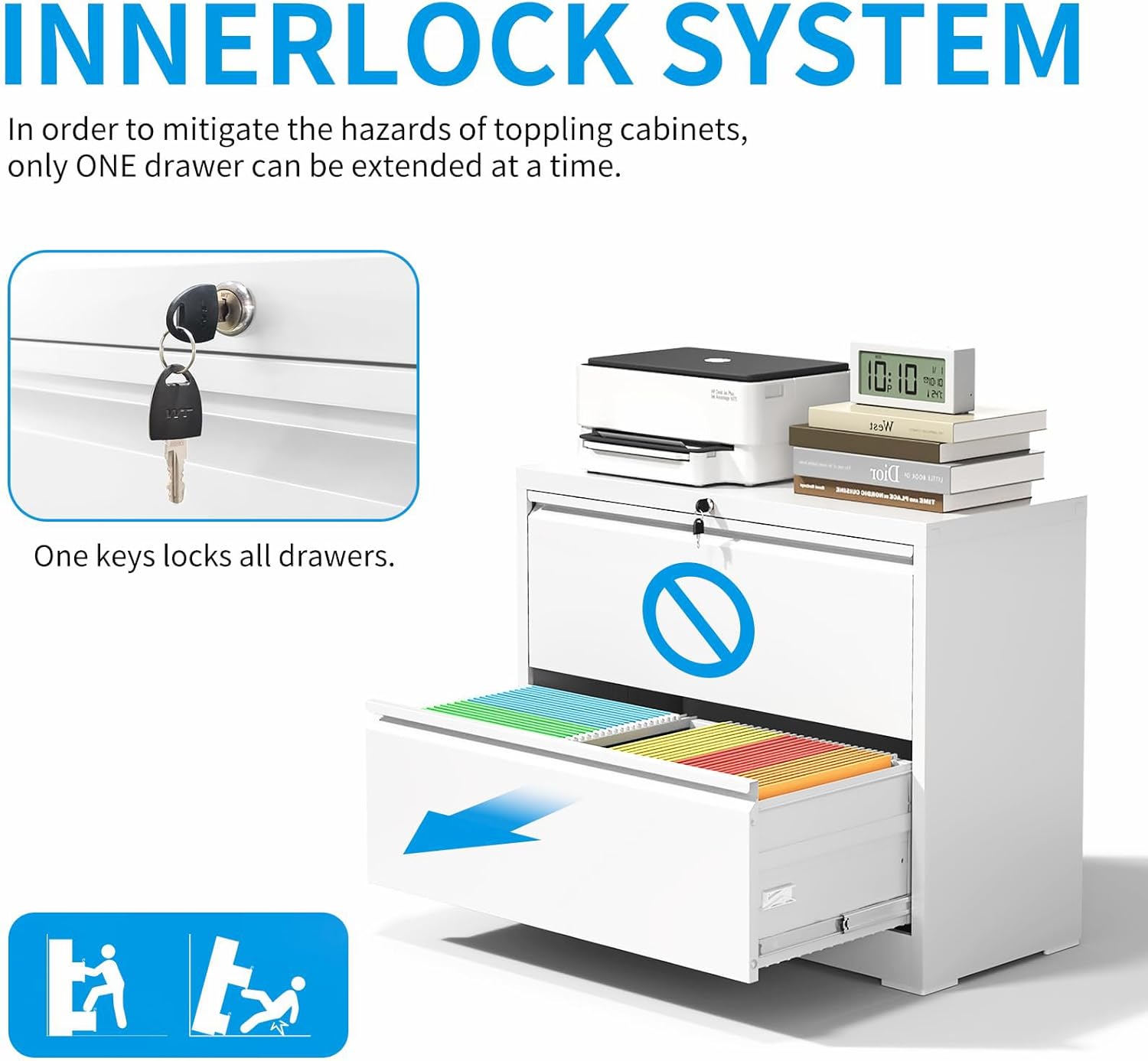 - 【Safety & Security】Interlock system prevents tipping when opening multiple heavy drawers. One lock with 2 keys secures all 2 drawers, add security to your home and office