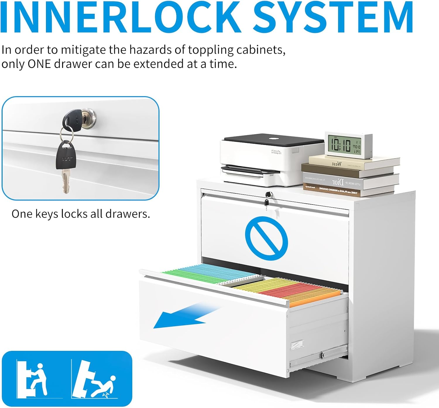 - 【Safety & Security】Interlock system prevents tipping and does not allow multiple drawers to be opened at the same time. The smooth, quiet sliding rails make opening and closing drawers effortless and noise-free. One lock with 2 keys secures all 2 drawers, it ensures that your files remain safe from unauthorized access.