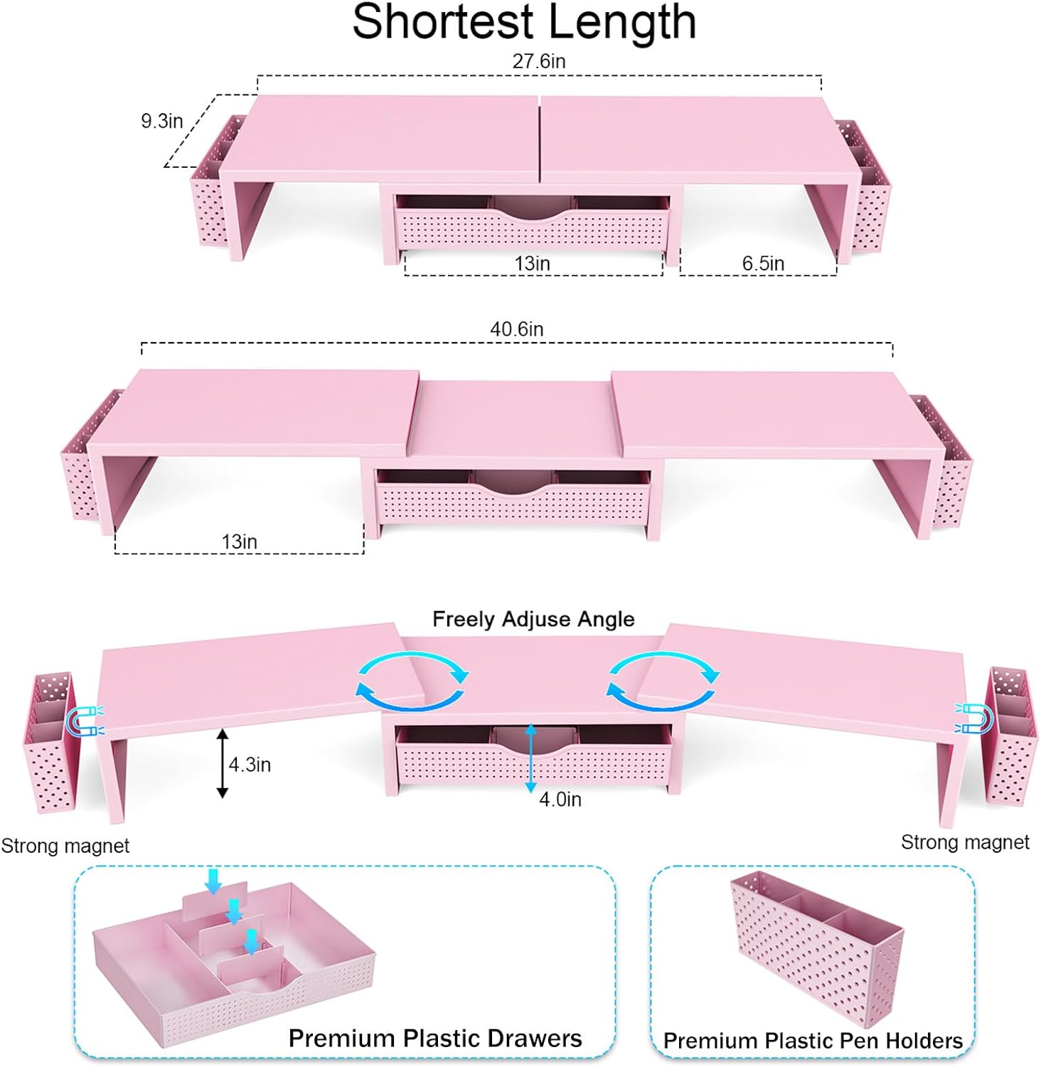 gianotter Dual Monitor Stand Riser, Desk Organizer With Drawer and 2 Pen Holders,Desk Organizers and Accessories, Pink Office Supplies (Pink)