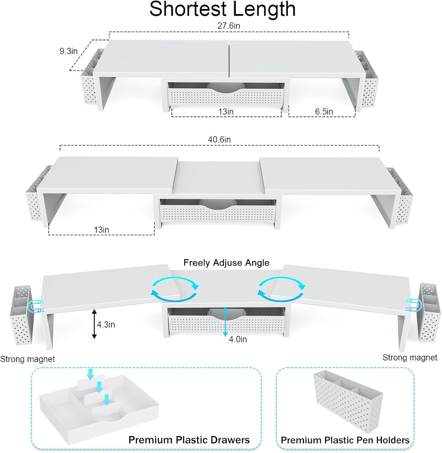 - ăAmple Storage SpaceăThe dual monitor stand features two magnetic pen holders and a drawer, allowing you to easily organize your desk accessories and office supplies, keeping your workspace clear and tidy for easier access.