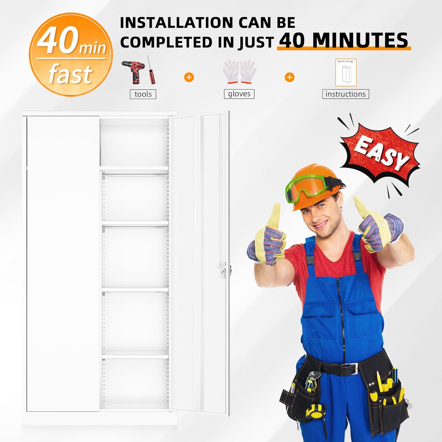 - 【Easy assembly】: Metal storage cabinet with 2 locking doors can be assembled step by step. There are 4 pre-holes on the back of the steel cabinet, you can screw it to the wall for stability.