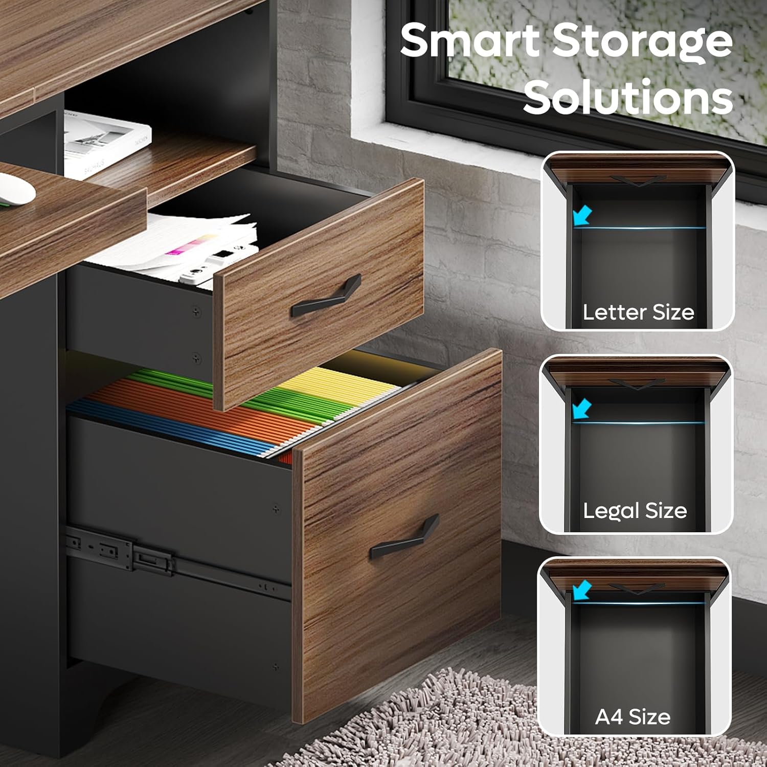 - Efficient Storage: This modern desk features an open storage compartment, a storage drawer, and a file drawer for letter/A4/legal-size hanging file folders, providing efficient storage solutions to keep your workspace organized and your essentials within reach