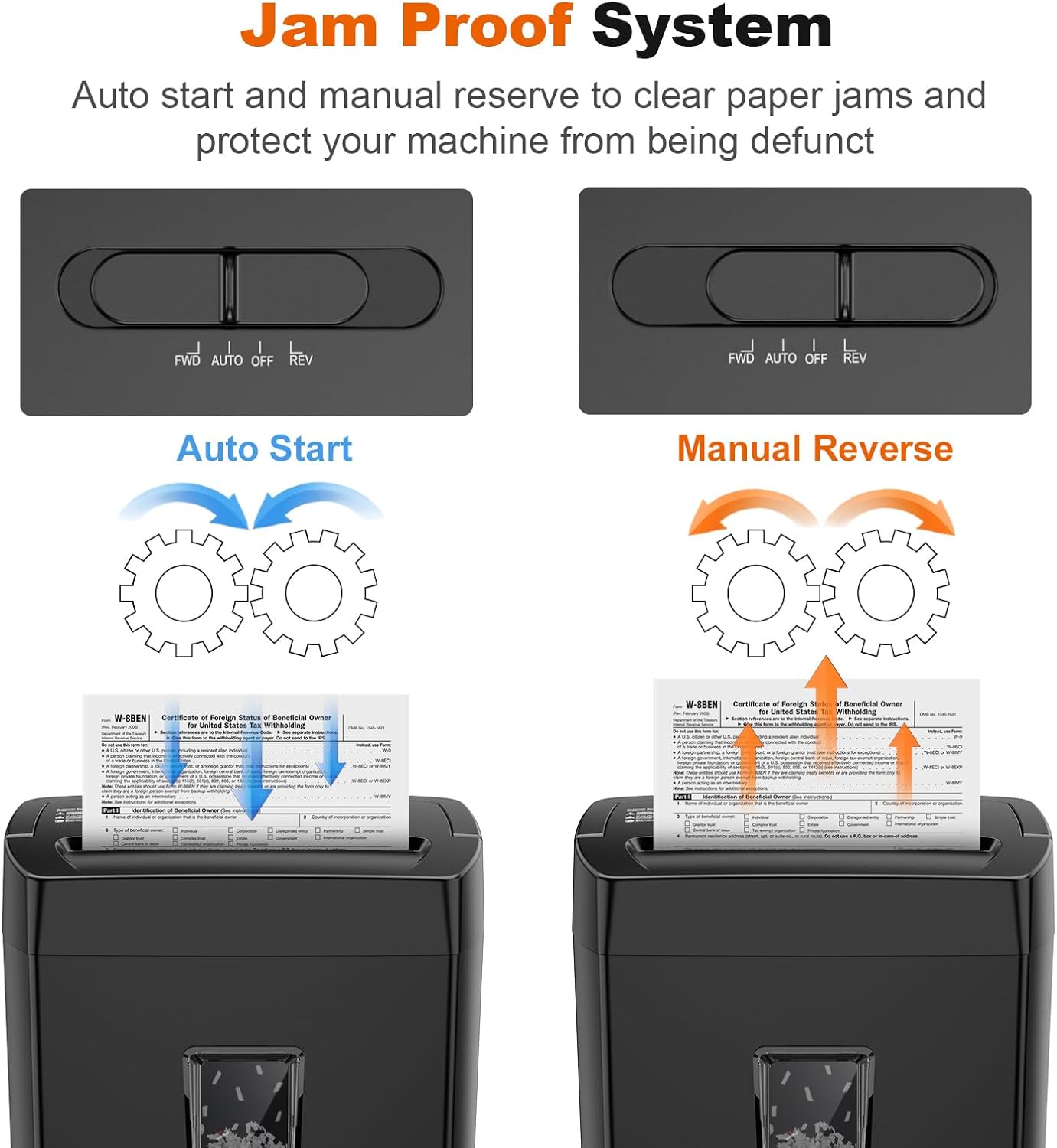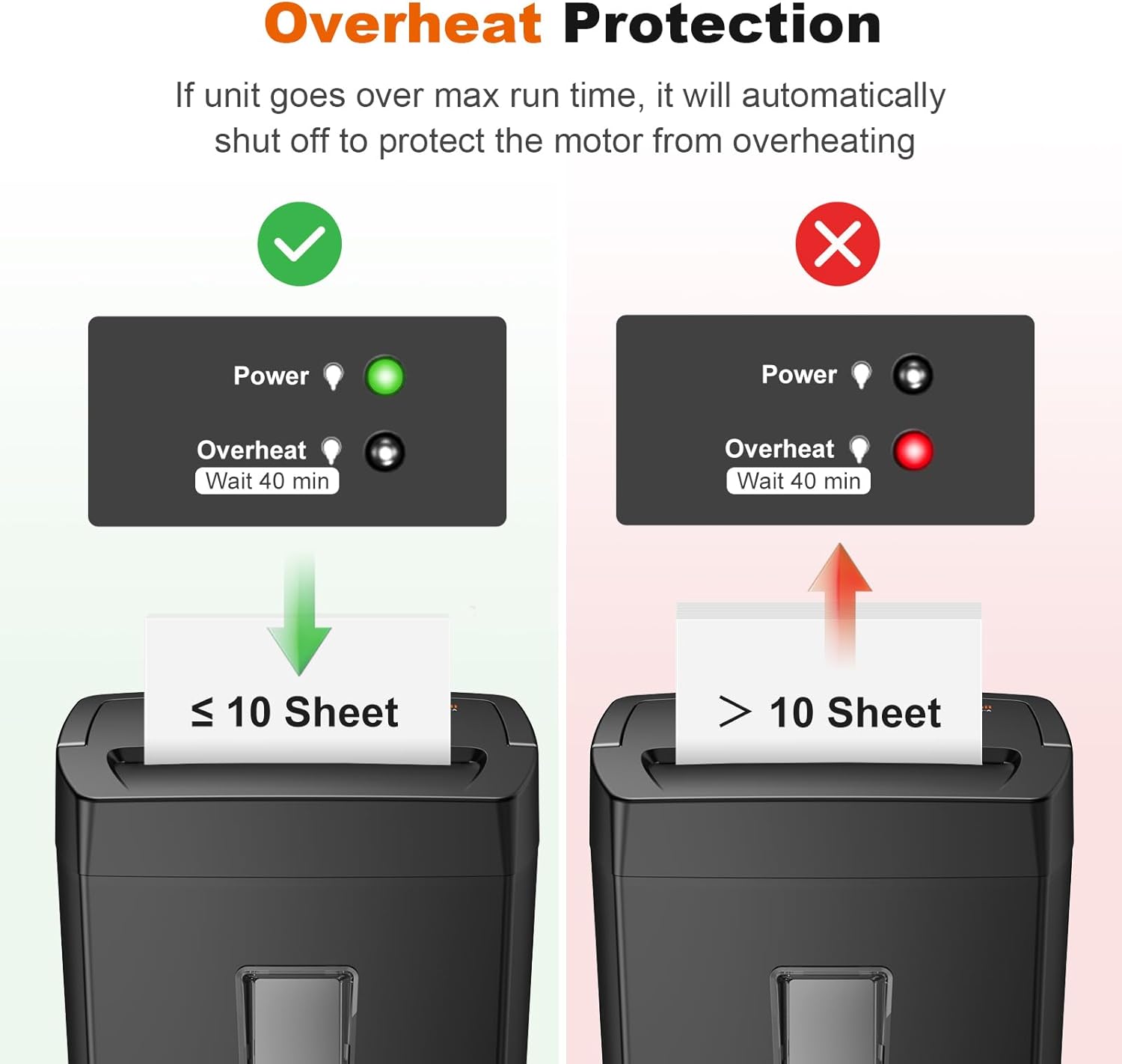 - Easy Operation & Safe Protection: Auto start/stop and manual-forward/reverse function protect the home paper shredder from the frustration of paper jams. Overheat protection helps you use paper shredder without worrying and prolong its lifetime
