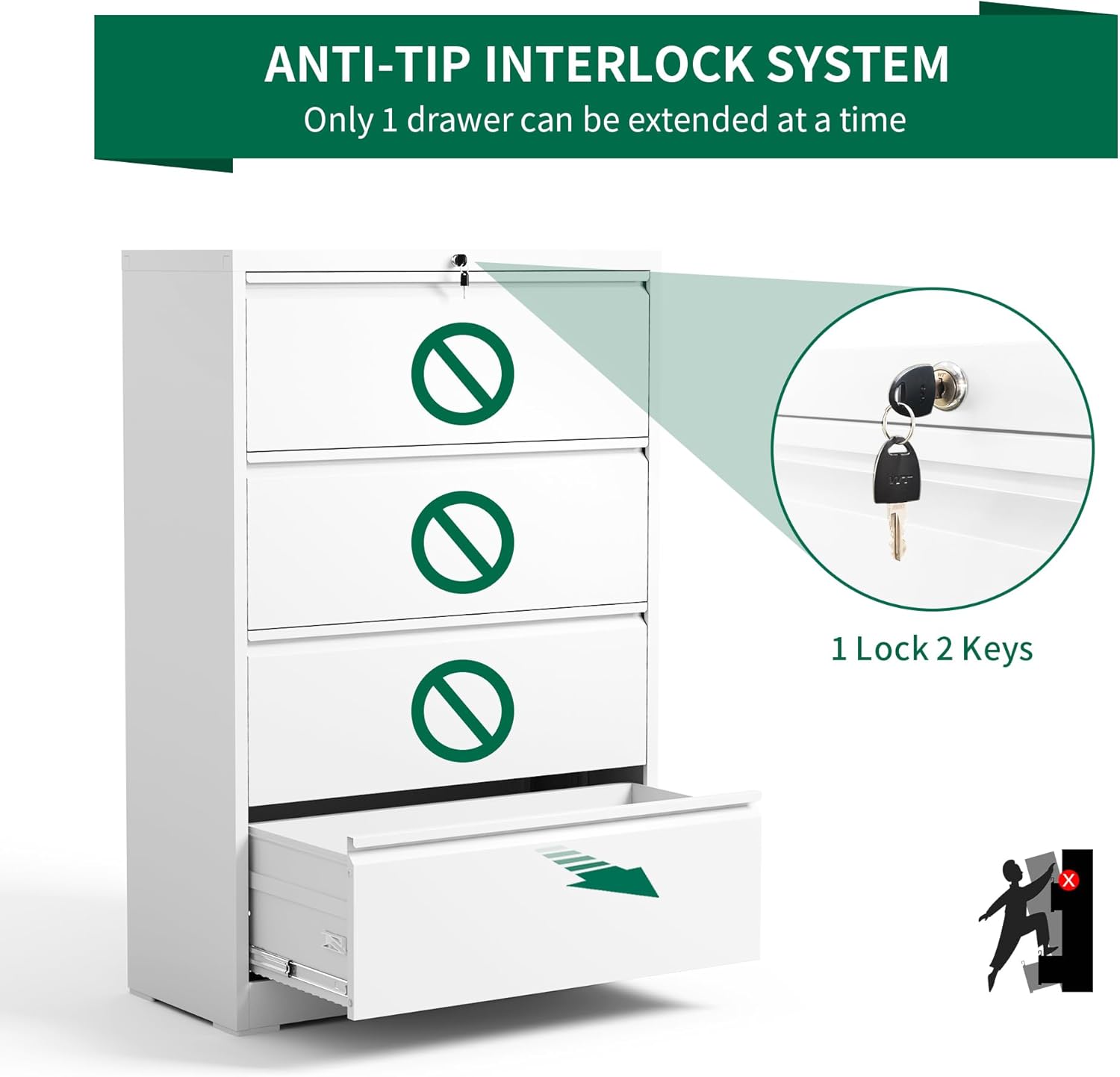 - ăLocking Cabinet for SecurityăThis 4 drawer file cabinet with lock has an anti-tip design, which ensures that only one drawer can be opened at a time, preventing tipping and protecting your safety. The upgraded interlock system with 1 lock and 2 keys keeps your important documents safe.