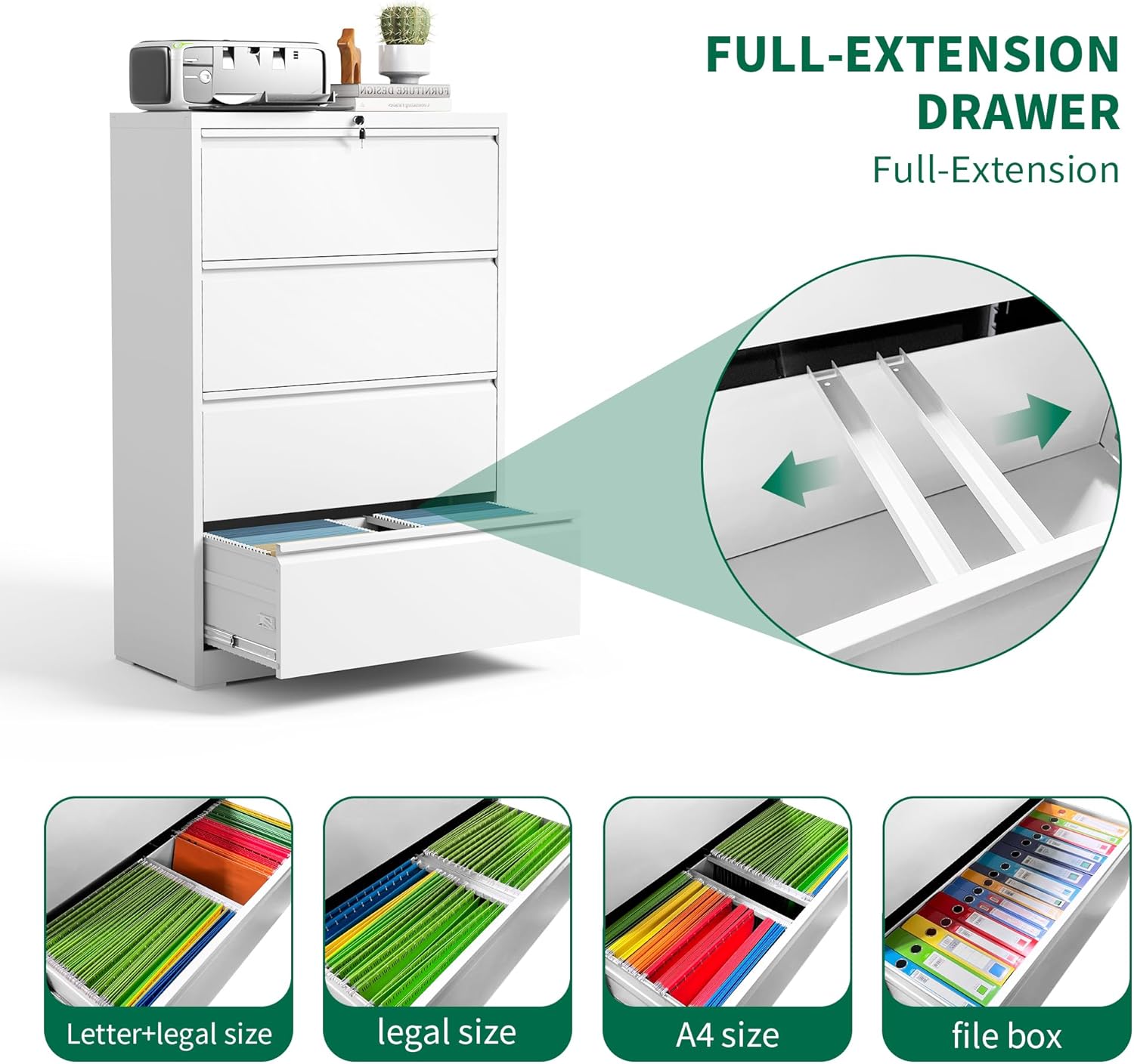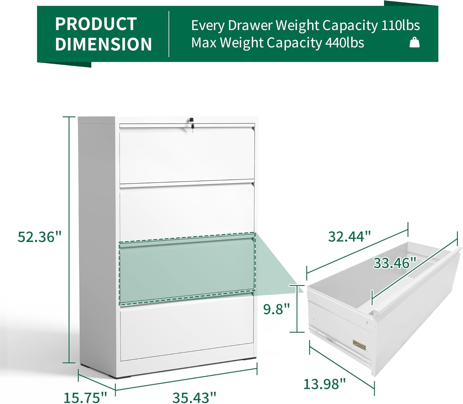- ăSturdy & Durable ConstructionăLateral filing cabinet with 4 drawer is made of high-strength all-steel material, which is sturdy and not easily deformed. The powder-coated surface can protect it from corrosion and rust, further extending its service life. Wide lateral filing cabinet holds 220 lbs and holds printers, scanners and more.