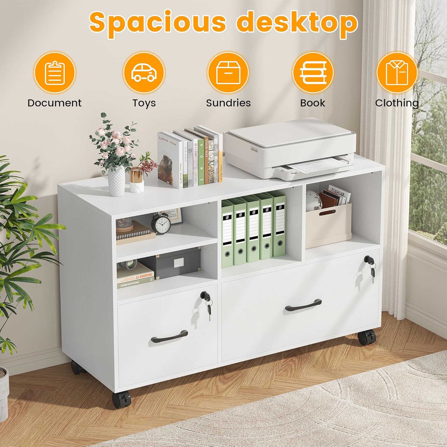 2 Drawer Wood Mobile Large Lateral File Cabinet with Lock, Lockable Rolling Filing Cabinet with Storage Shelves, Printer Stand Office Storage for Home Office Fits Files Legal/A4,White