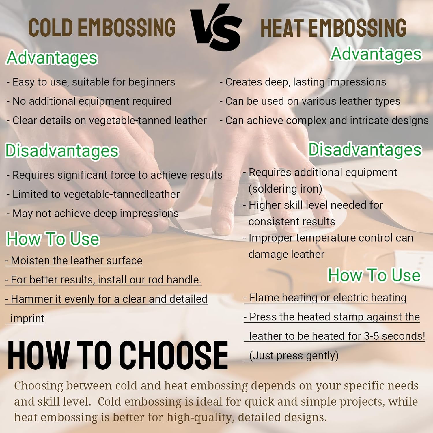 - Versatile Embossing Options: This custom leather stamp offers two distinct embossing effects on leather: cold embossing, achieved by striking the back of the stamp handle with a hammer or mallet to create a clean, pressed effect that captures intricate designs; and heat embossing, which utilizes a soldering iron to produce more detailed and defined impressions, making it ideal for adding logos or complex patterns