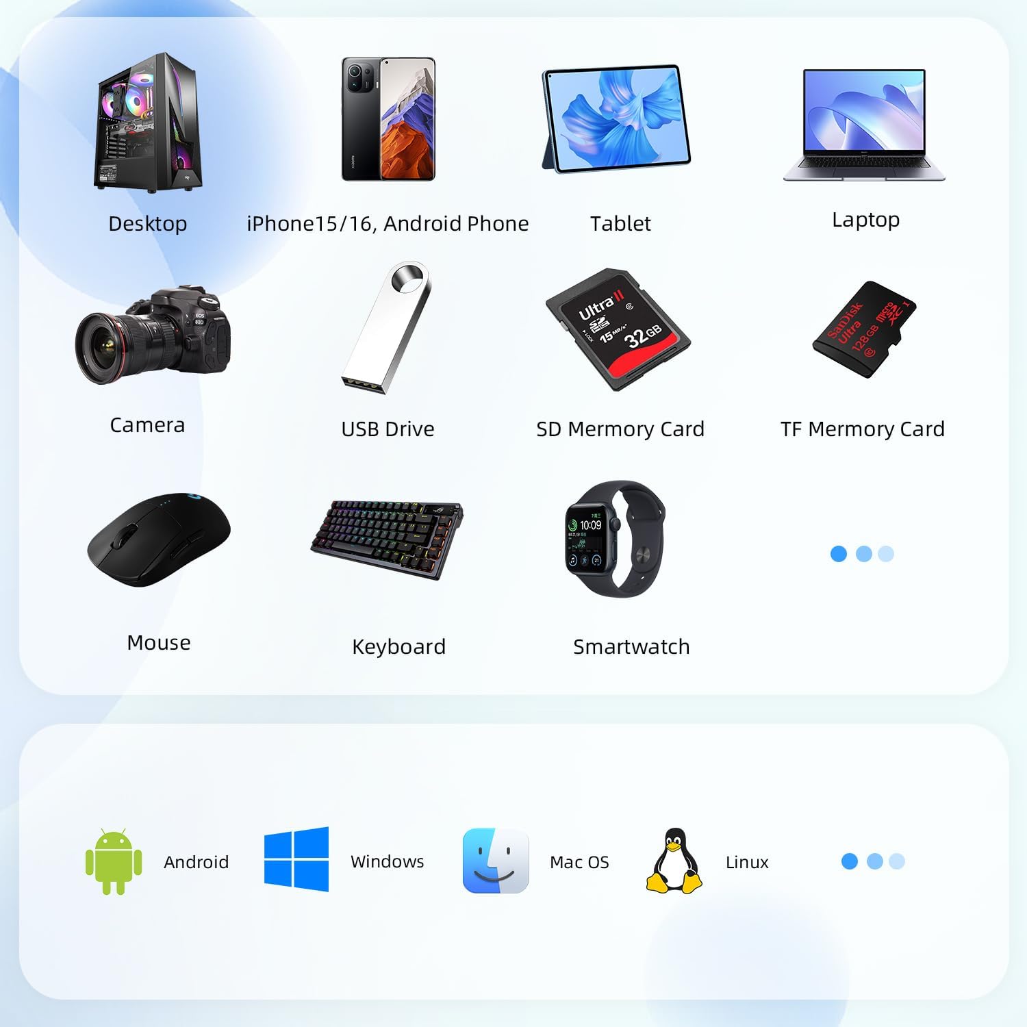 - Multiple Interface Support: The product has a built-in 1TB hard disk and supports USB-C, USB 3.0, USB 2.0, SD card slot and TF card slot, which meets the needs of daily work. The product connects to the computer via data cable to realize multi-device interoperability.